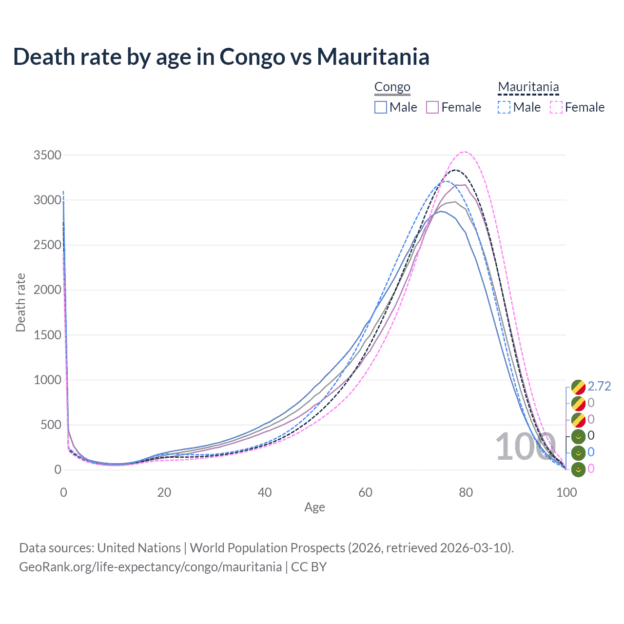 In the Congo, the most common age of death is 78, compared to 78 in Mauritania. The median age of death is 71.8 in the Congo and 74.1 in Mauritania, meaning only half of each cohort is expected to live past that age.