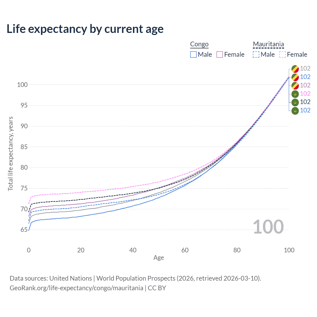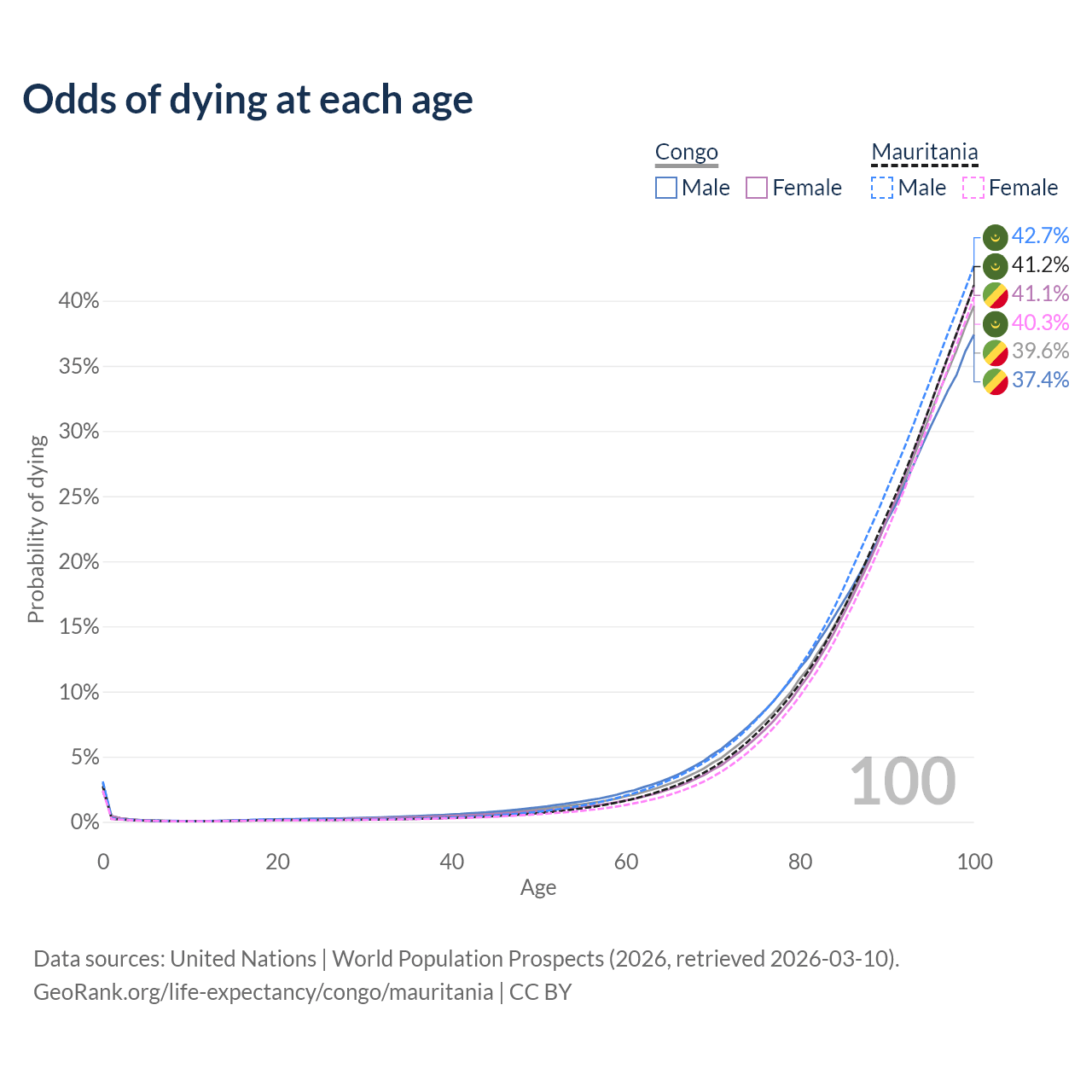 This life expectancy calculator shows the odds of living to 100, 95, 90, and below based on current age for both males and females in the Congo and Mauritania, along with mean and median age of death. The calculations are based on the 2026 life tables (actuarial tables) from the UN World Population Prospects.