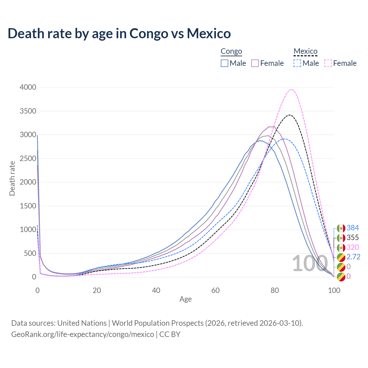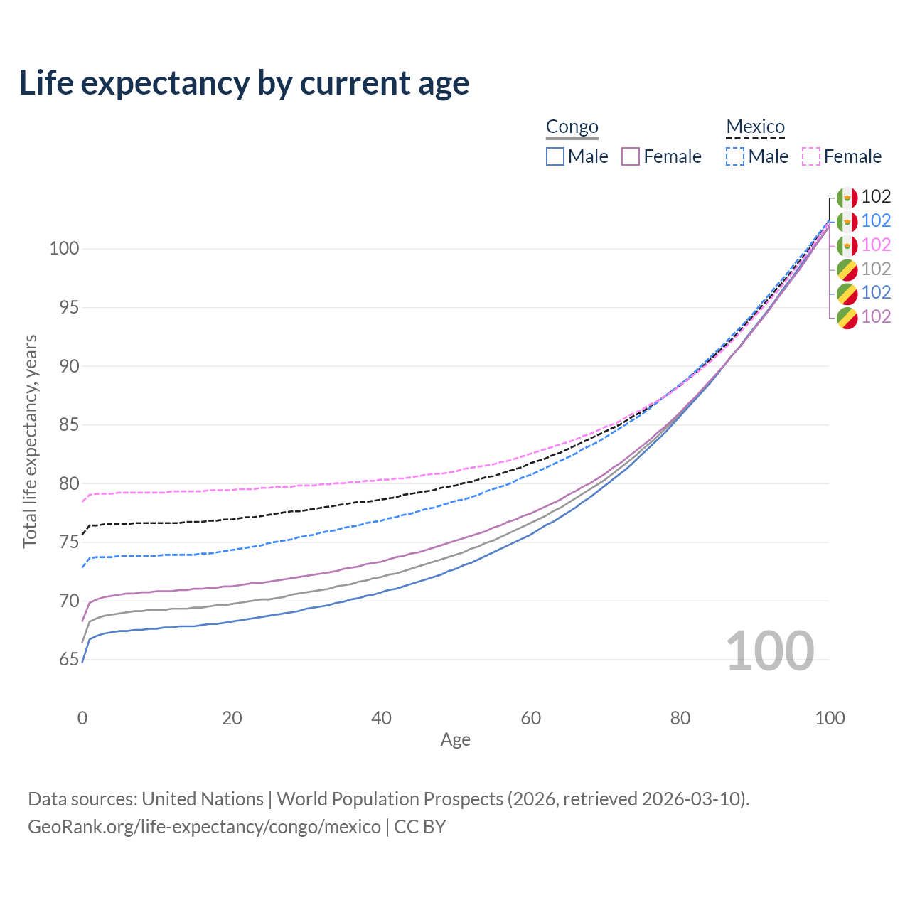 This life expectancy calculator shows the odds of living to 100, 95, 90, and below based on current age for both males and females in the Congo and Mexico, along with mean and median age of death. The calculations are based on the 2026 life tables (actuarial tables) from the UN World Population Prospects.