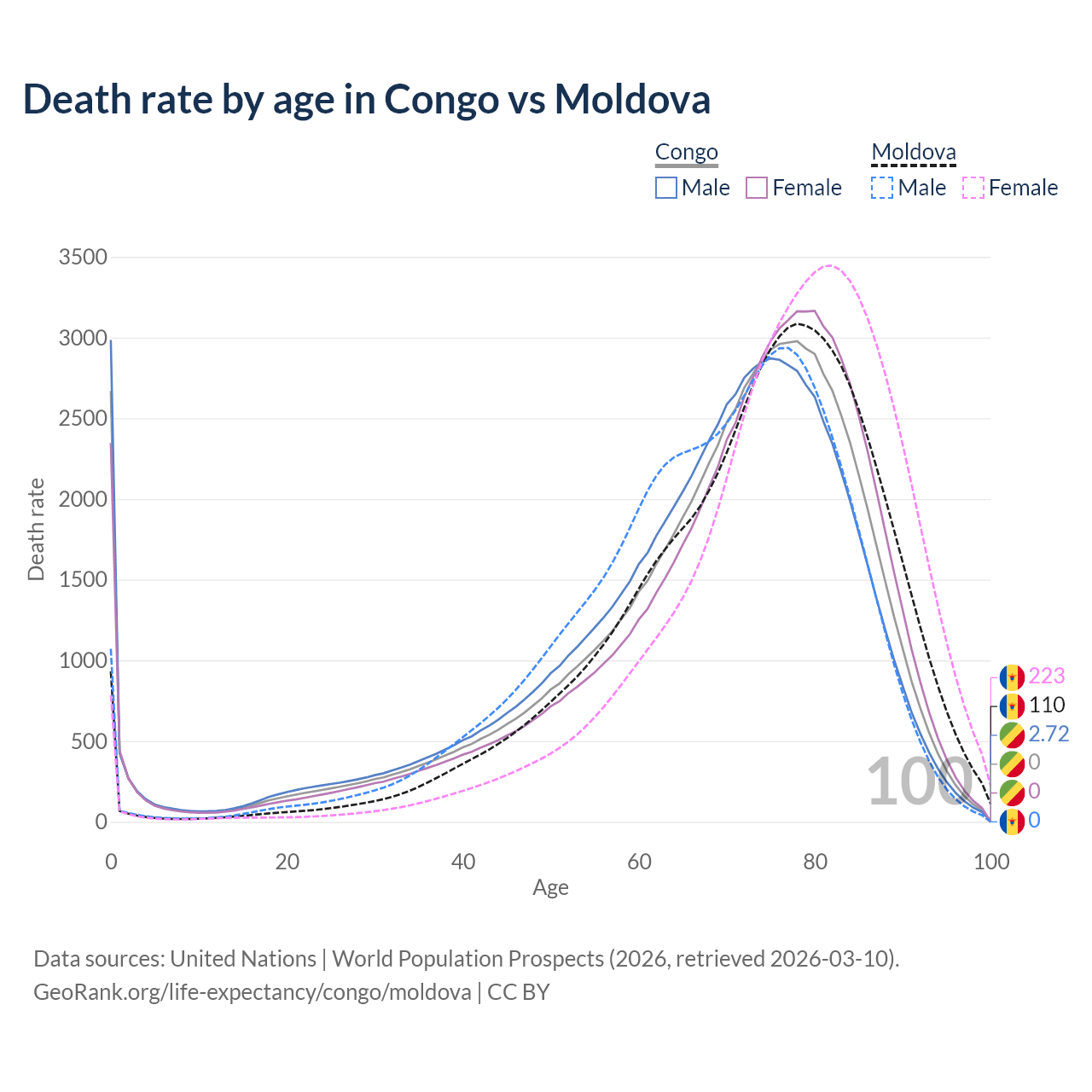 The average life expectancy at birth is 66.4 years in the Congo vs 71.6 in Moldova. The Congo is ranked 168/197 by life expectancy, and Moldova is 129/197. In the Congo, the life expectancy is 64.7 years for males and 68.2 years for females. In Moldova, it's 67 years for males and 75.9 years for females.