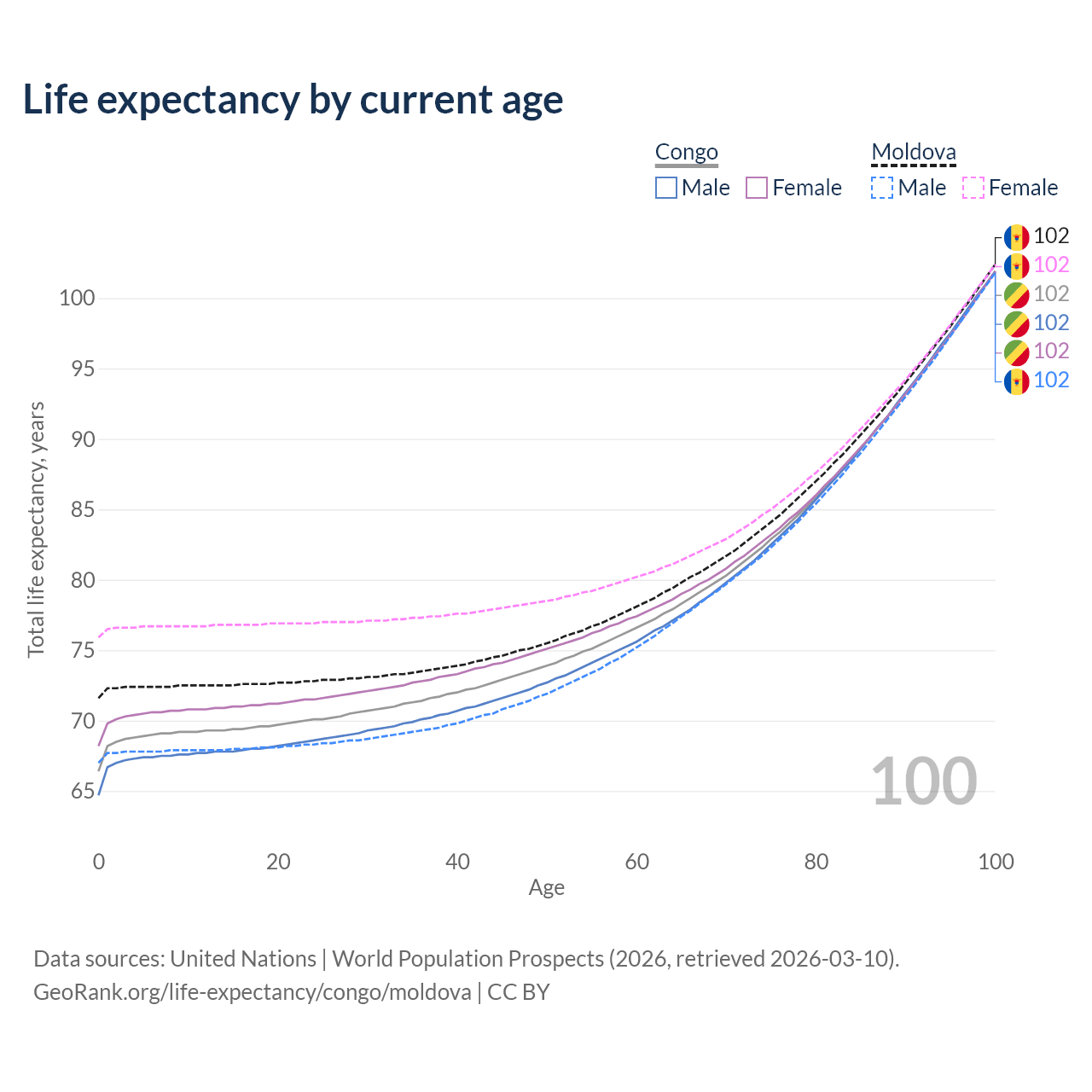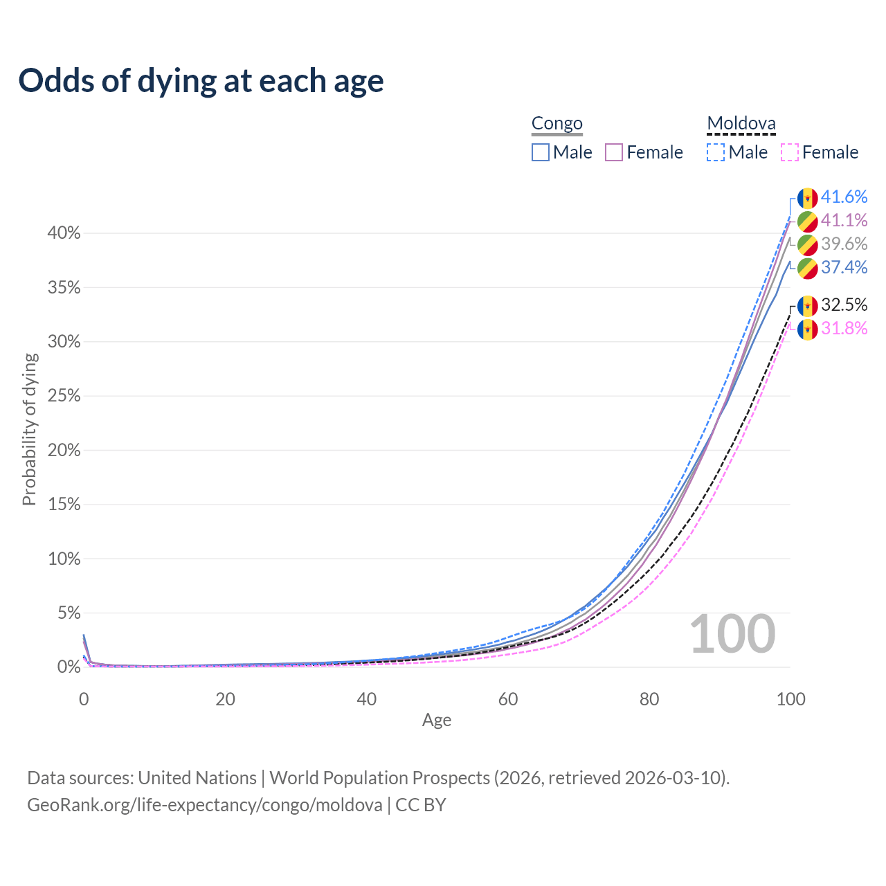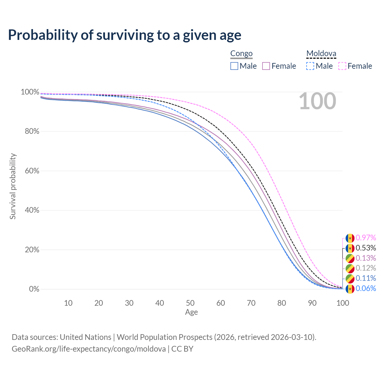 This life expectancy calculator shows the odds of living to 100, 95, 90, and below based on current age for both males and females in the Congo and Moldova, along with mean and median age of death. The calculations are based on the 2026 life tables (actuarial tables) from the UN World Population Prospects.