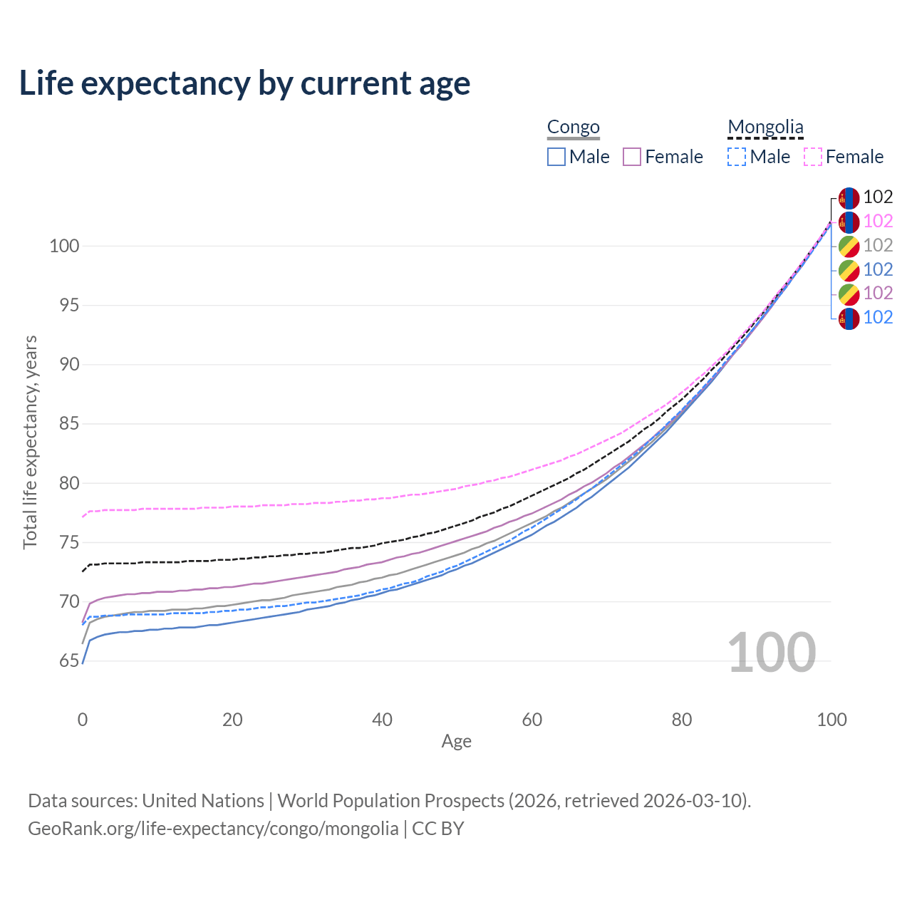 This life expectancy calculator shows the odds of living to 100, 95, 90, and below based on current age for both males and females in the Congo and Mongolia, along with mean and median age of death. The calculations are based on the 2026 life tables (actuarial tables) from the UN World Population Prospects.