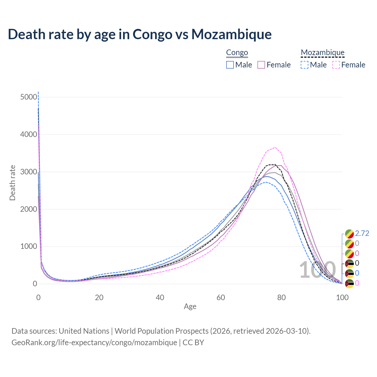 In the Congo, the most common age of death is 78, compared to 0 in Mozambique. The median age of death is 71.8 in the Congo and 71.2 in Mozambique, meaning only half of each cohort is expected to live past that age.