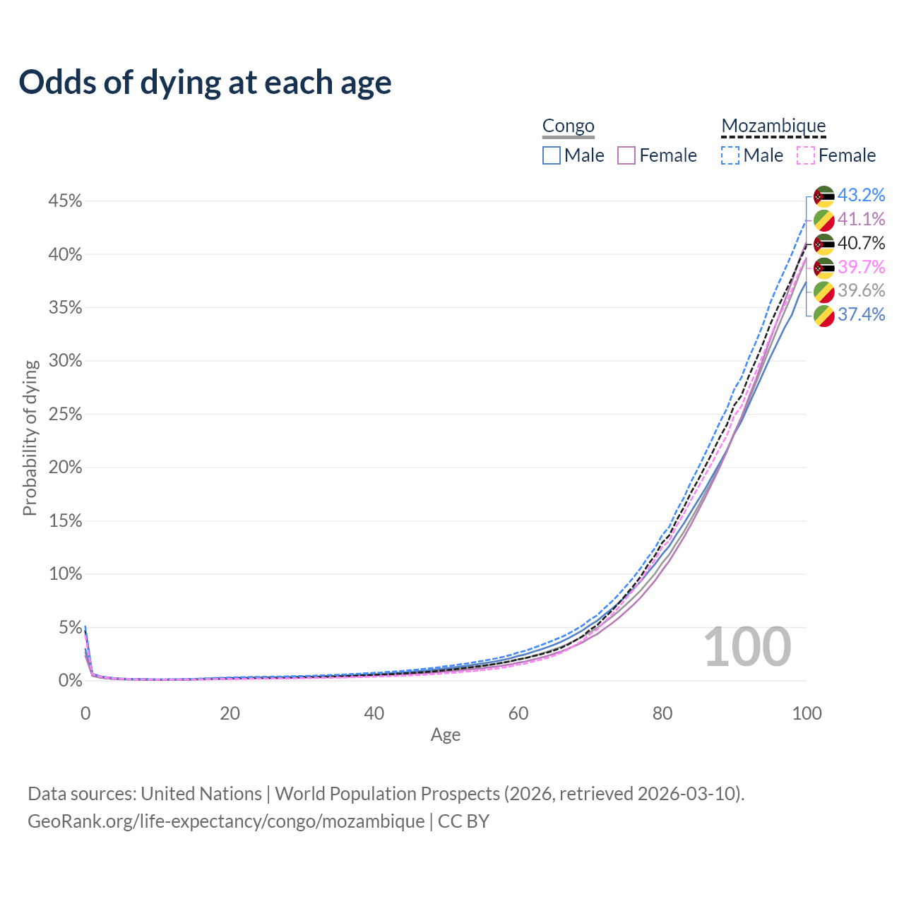 This life expectancy calculator shows the odds of living to 100, 95, 90, and below based on current age for both males and females in the Congo and Mozambique, along with mean and median age of death. The calculations are based on the 2026 life tables (actuarial tables) from the UN World Population Prospects.
