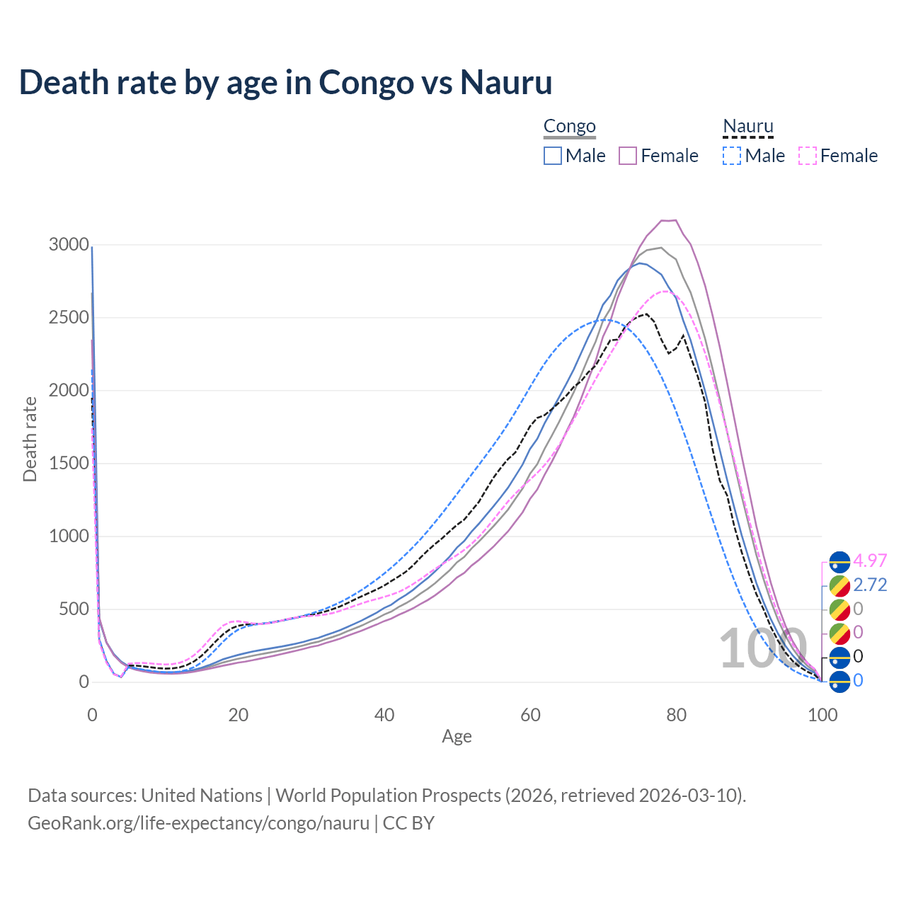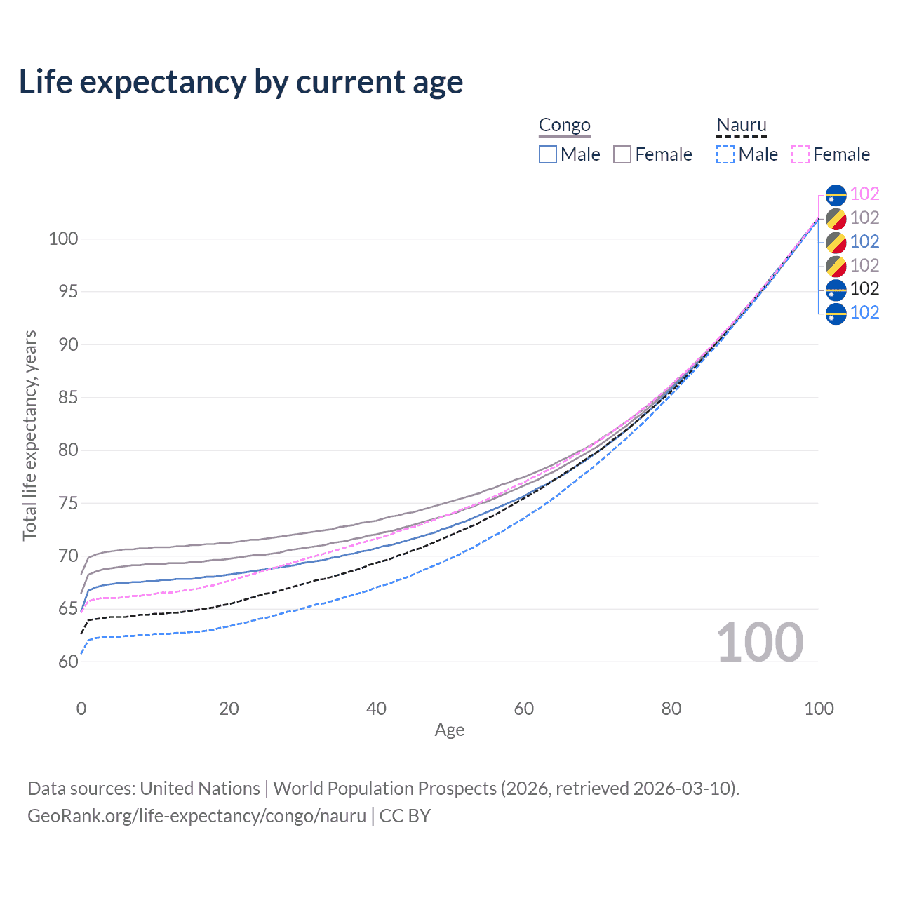 This life expectancy calculator shows the odds of living to 100, 95, 90, and below based on current age for both males and females in the Congo and Nauru, along with mean and median age of death. The calculations are based on the 2026 life tables (actuarial tables) from the UN World Population Prospects.