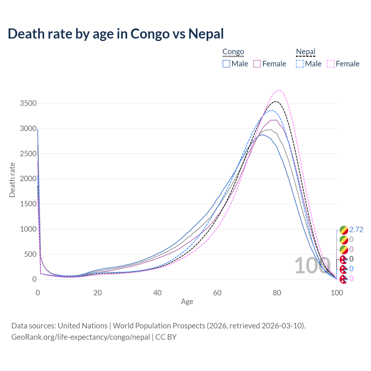 In the Congo, the most common age of death is 78, compared to 80 in Nepal. The median age of death is 71.8 in the Congo and 75.4 in Nepal, meaning only half of each cohort is expected to live past that age.