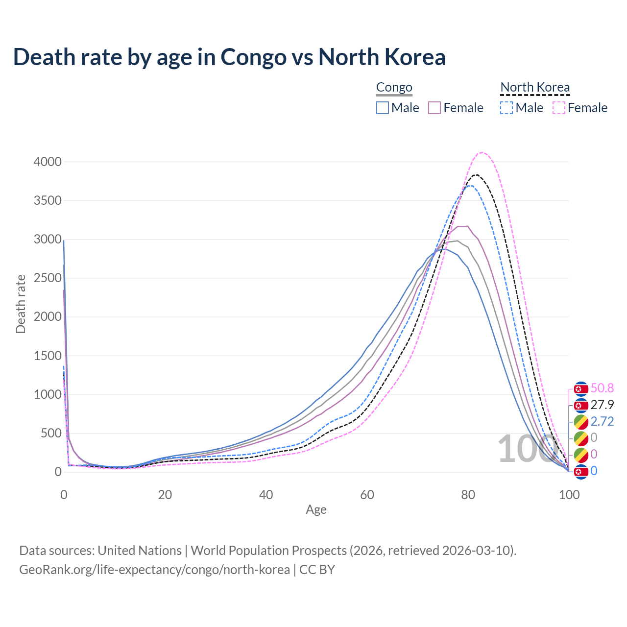 In the Congo, the most common age of death is 78, compared to 82 in North Korea. The median age of death is 71.8 in the Congo and 78.5 in North Korea, meaning only half of each cohort is expected to live past that age.