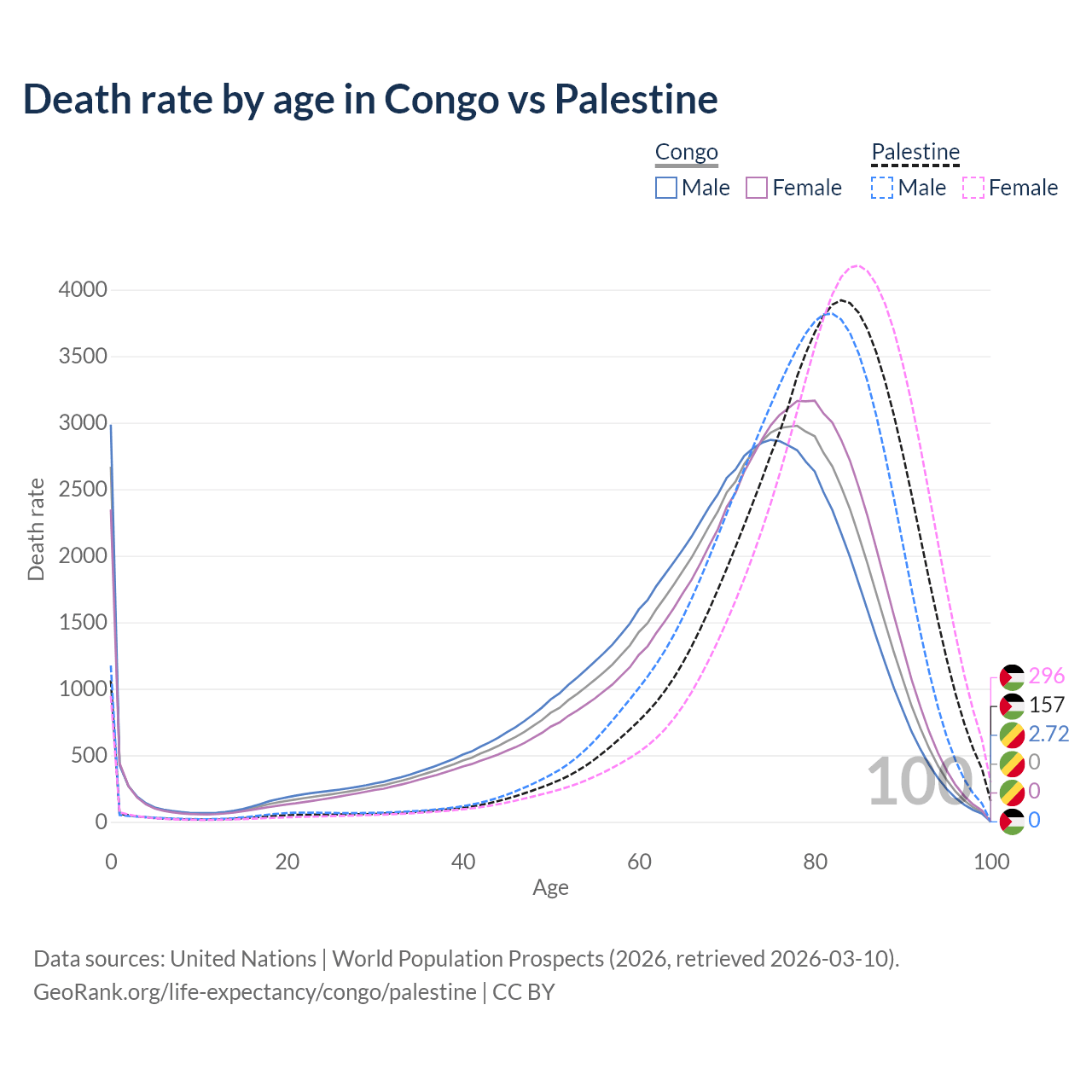 In the Congo, the most common age of death is 78, compared to 83 in Palestine. The median age of death is 71.8 in the Congo and 80.5 in Palestine, meaning only half of each cohort is expected to live past that age.