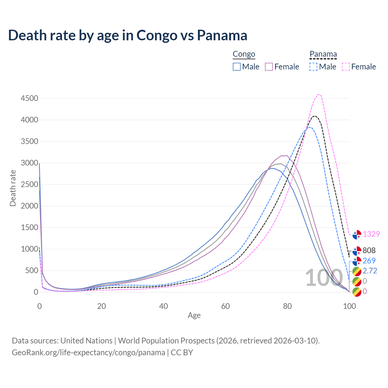 In the Congo, the most common age of death is 78, compared to 89 in Panama. The median age of death is 71.8 in the Congo and 84.6 in Panama, meaning only half of each cohort is expected to live past that age.