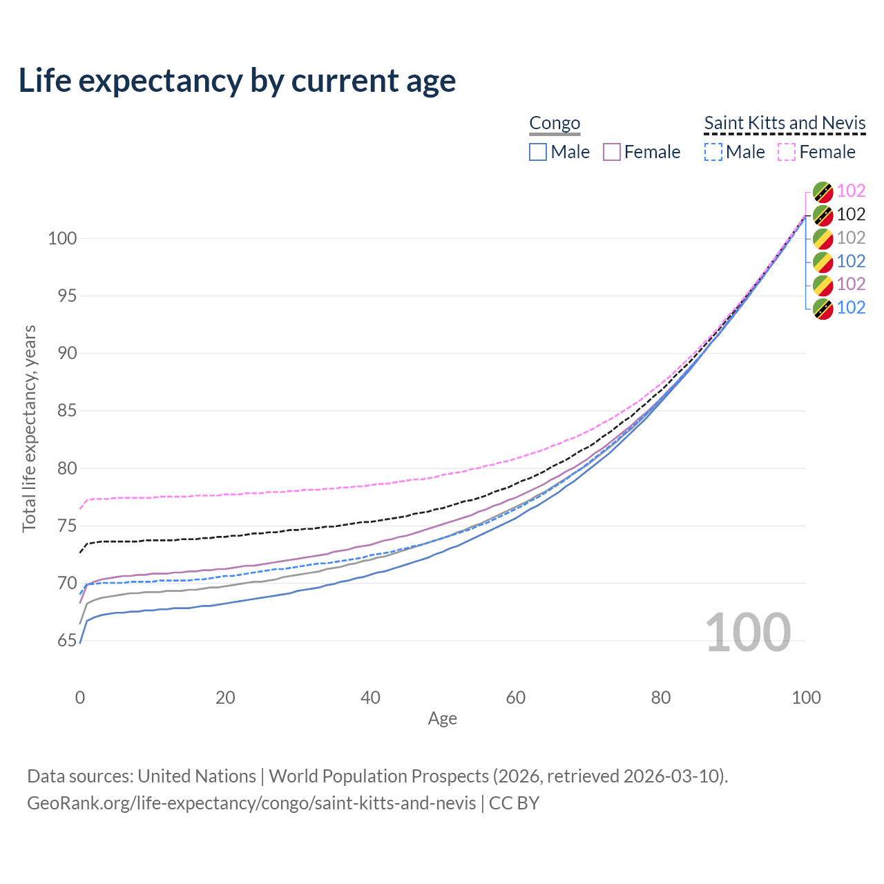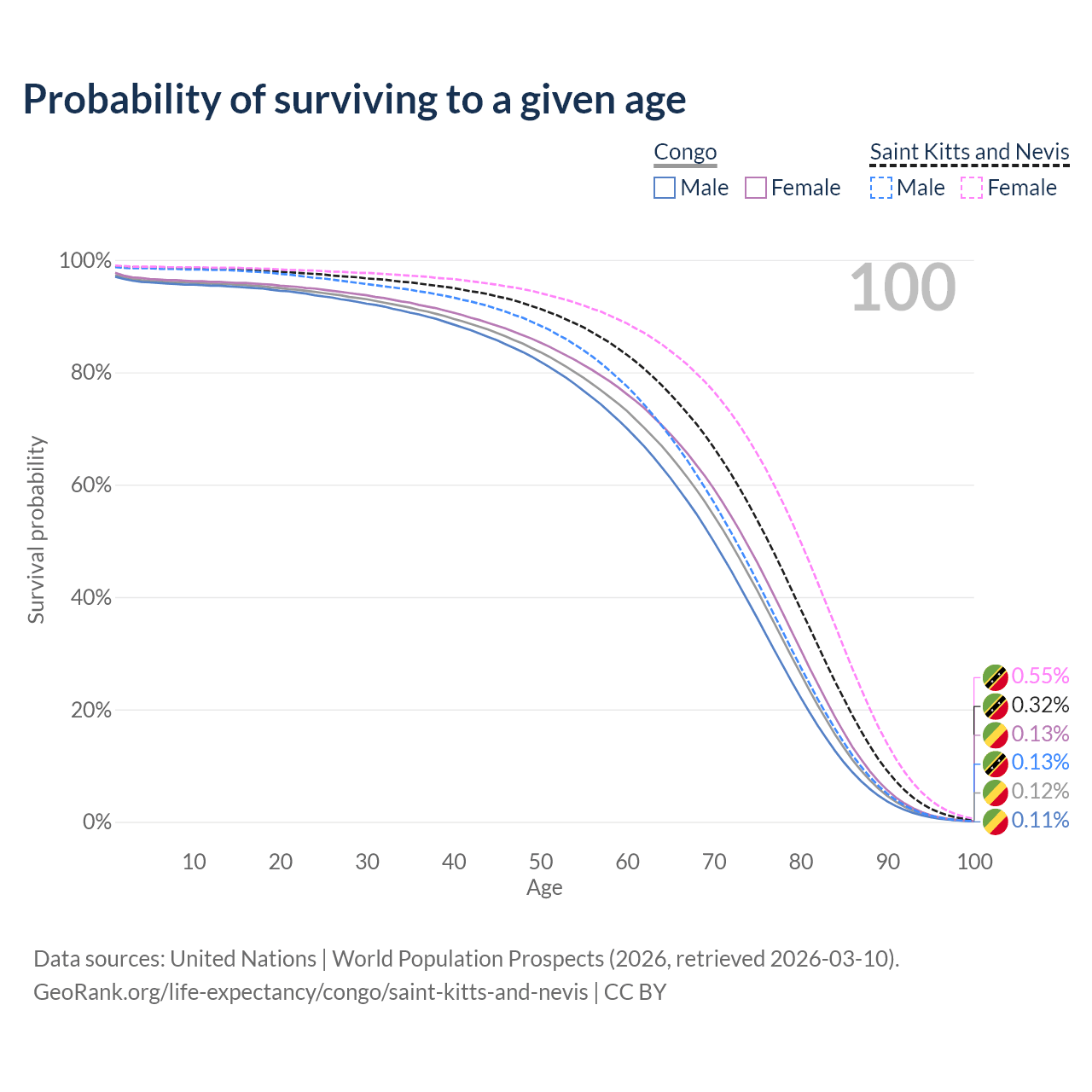 This life expectancy calculator shows the odds of living to 100, 95, 90, and below based on current age for both males and females in the Congo and Saint Kitts and Nevis, along with mean and median age of death. The calculations are based on the 2026 life tables (actuarial tables) from the UN World Population Prospects.
