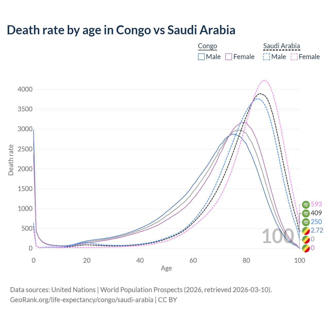 In the Congo, the most common age of death is 78, compared to 85 in Saudi Arabia. The median age of death is 71.8 in the Congo and 82.5 in Saudi Arabia, meaning only half of each cohort is expected to live past that age.