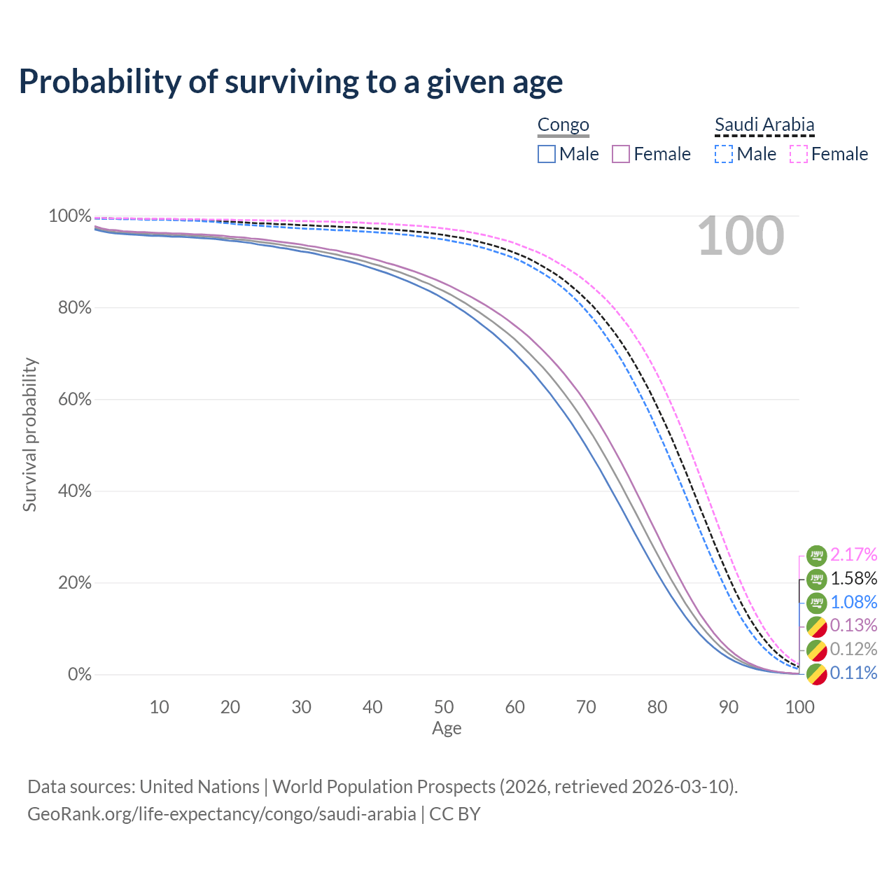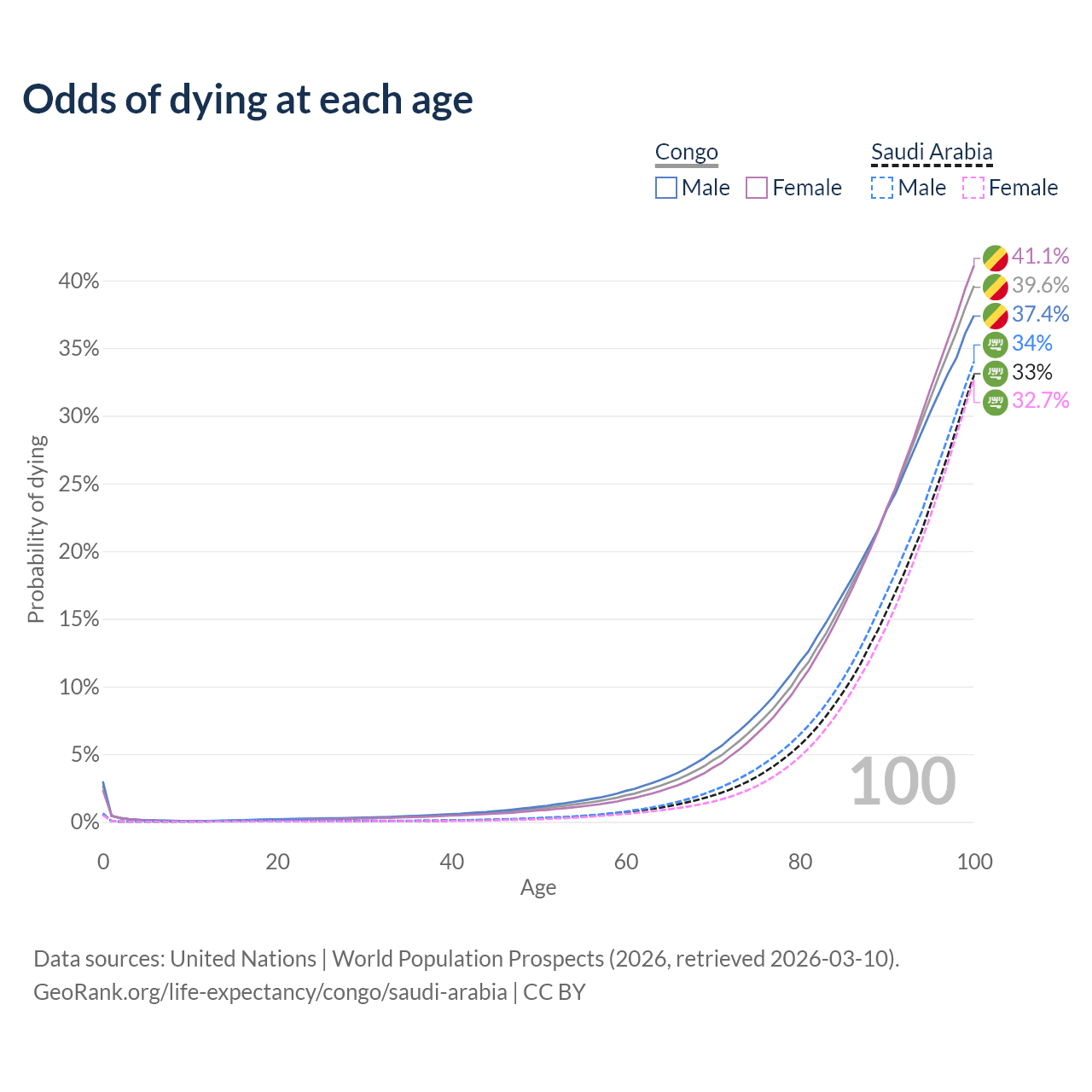 This life expectancy calculator shows the odds of living to 100, 95, 90, and below based on current age for both males and females in the Congo and Saudi Arabia, along with mean and median age of death. The calculations are based on the 2026 life tables (actuarial tables) from the UN World Population Prospects.
