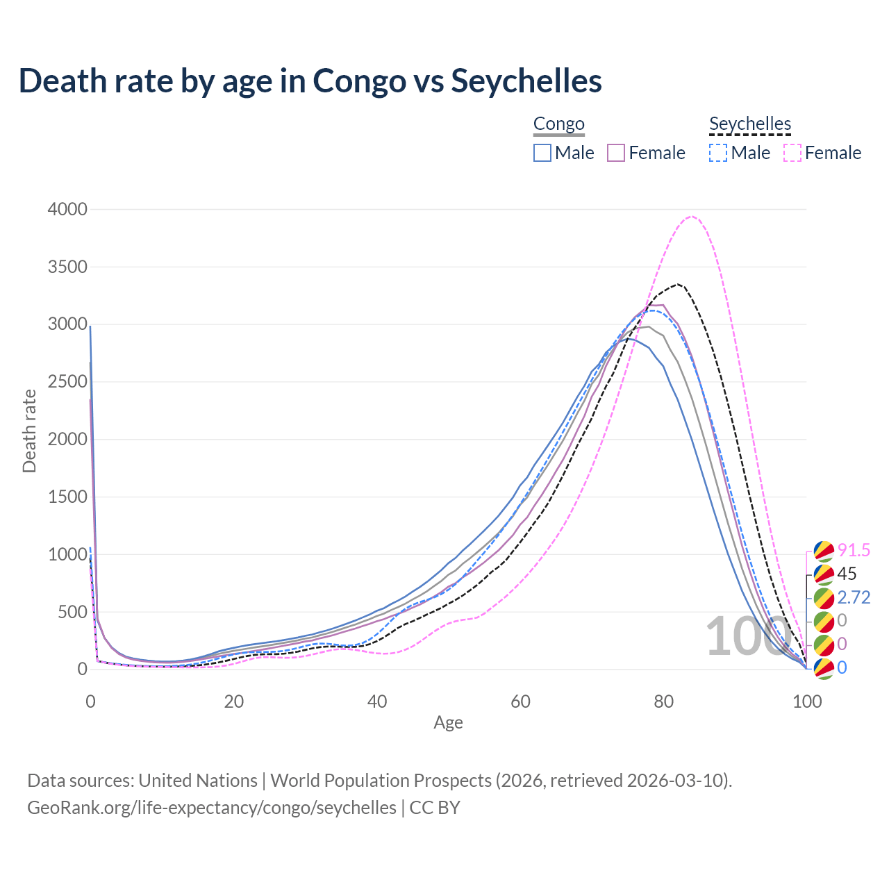 In the Congo, the most common age of death is 78, compared to 82 in the Seychelles. The median age of death is 71.8 in the Congo and 77 in the Seychelles, meaning only half of each cohort is expected to live past that age.