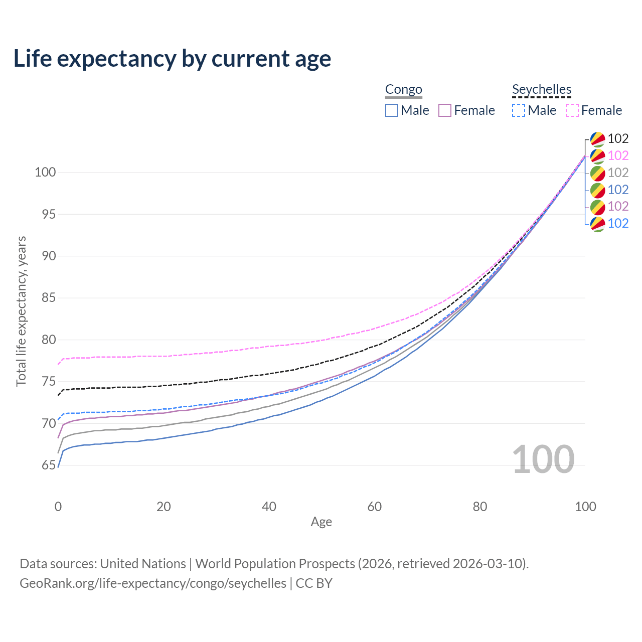 This life expectancy calculator shows the odds of living to 100, 95, 90, and below based on current age for both males and females in the Congo and the Seychelles, along with mean and median age of death. The calculations are based on the 2026 life tables (actuarial tables) from the UN World Population Prospects.