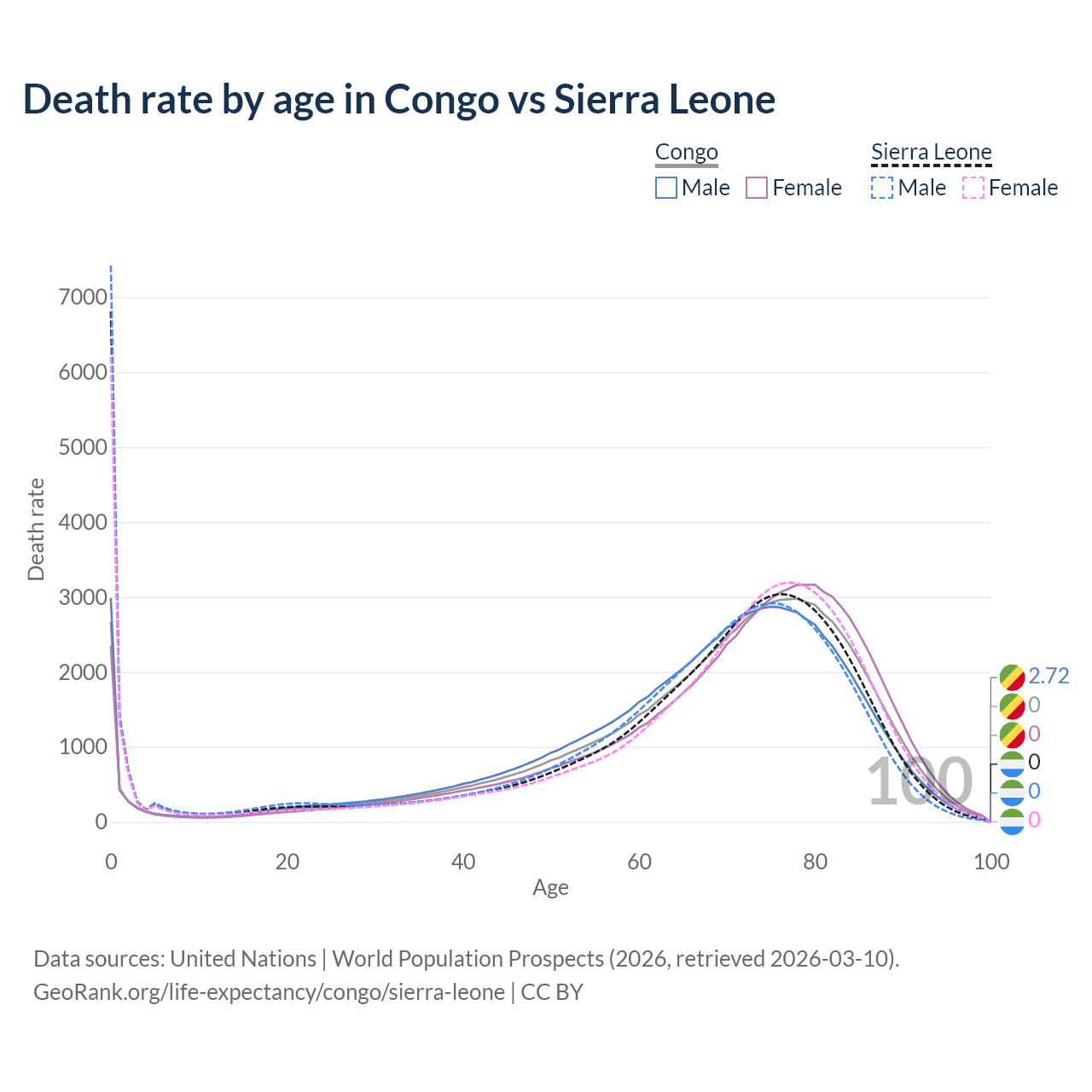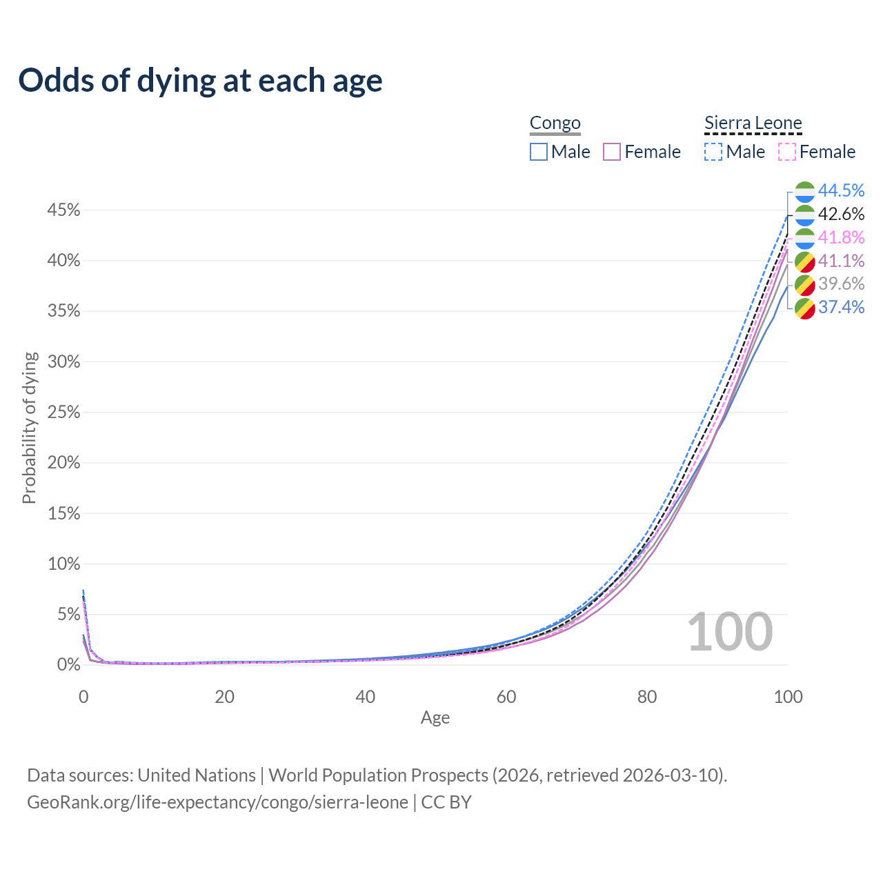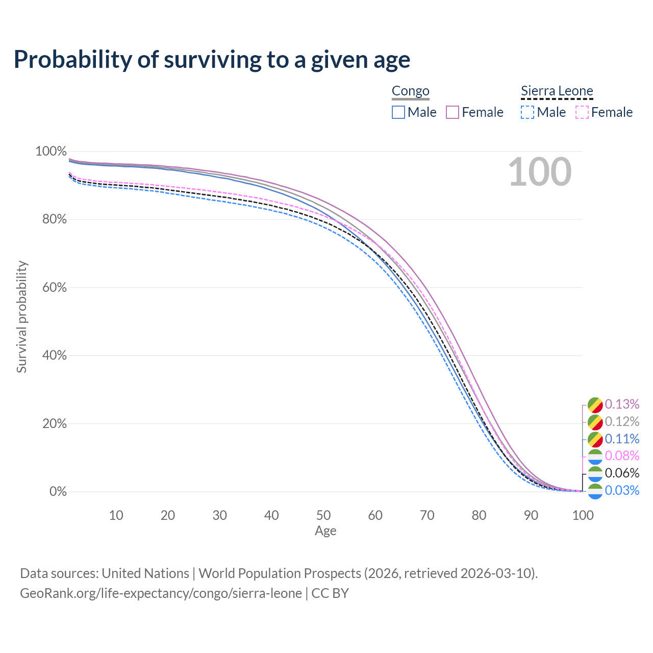 This life expectancy calculator shows the odds of living to 100, 95, 90, and below based on current age for both males and females in the Congo and Sierra Leone, along with mean and median age of death. The calculations are based on the 2026 life tables (actuarial tables) from the UN World Population Prospects.