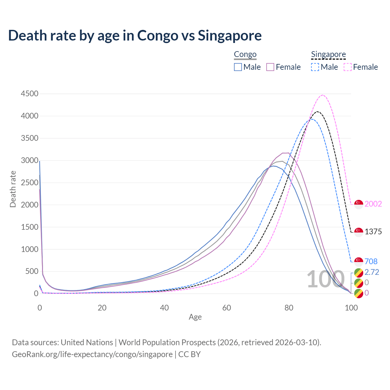 The average life expectancy at birth is 66.4 years in the Congo vs 84.1 in Singapore. The Congo is ranked 168/197 by life expectancy, and Singapore is 9/197. In the Congo, the life expectancy is 64.7 years for males and 68.2 years for females. In Singapore, it's 81.7 years for males and 86.6 years for females.