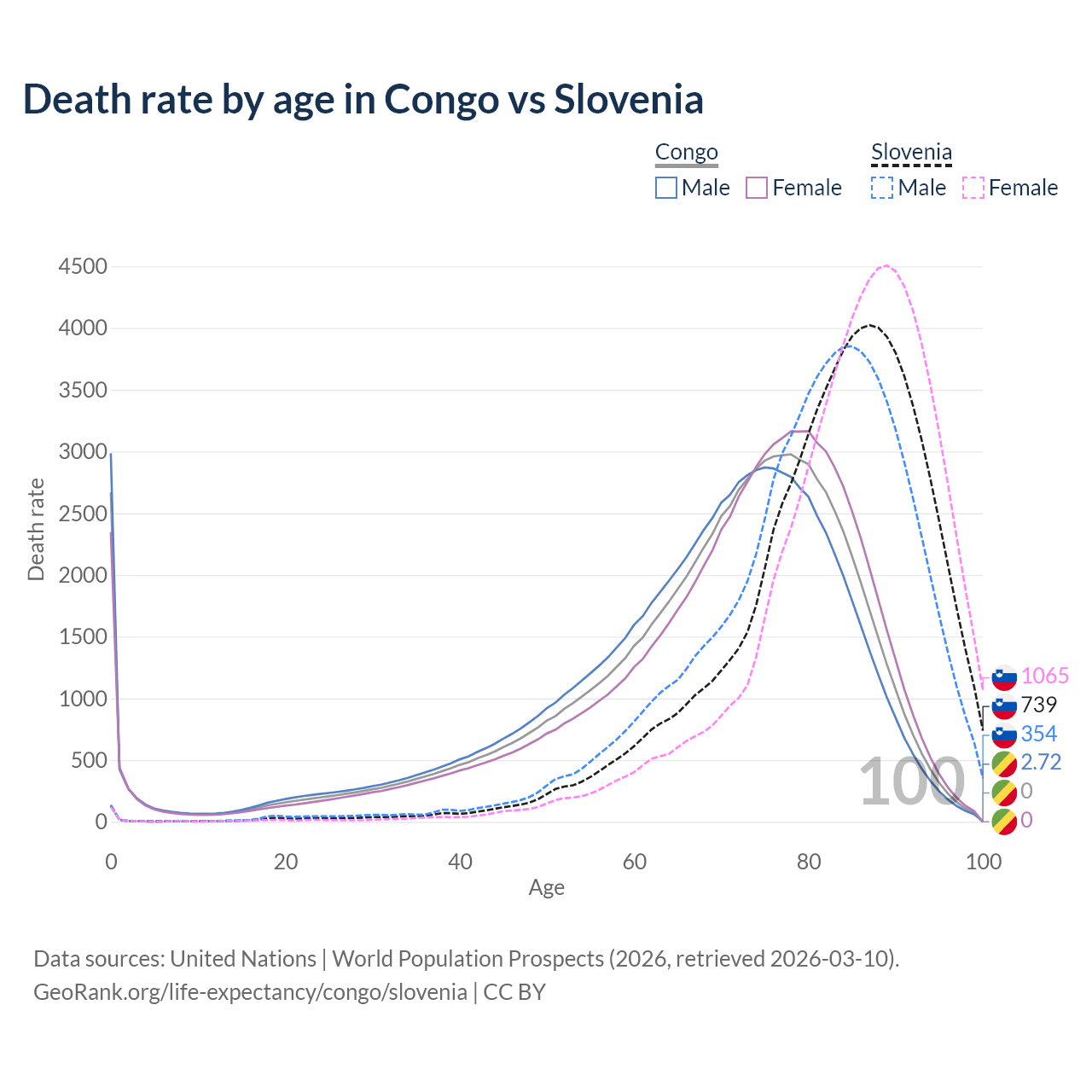 In the Congo, the most common age of death is 78, compared to 87 in Slovenia. The median age of death is 71.8 in the Congo and 84.4 in Slovenia, meaning only half of each cohort is expected to live past that age.