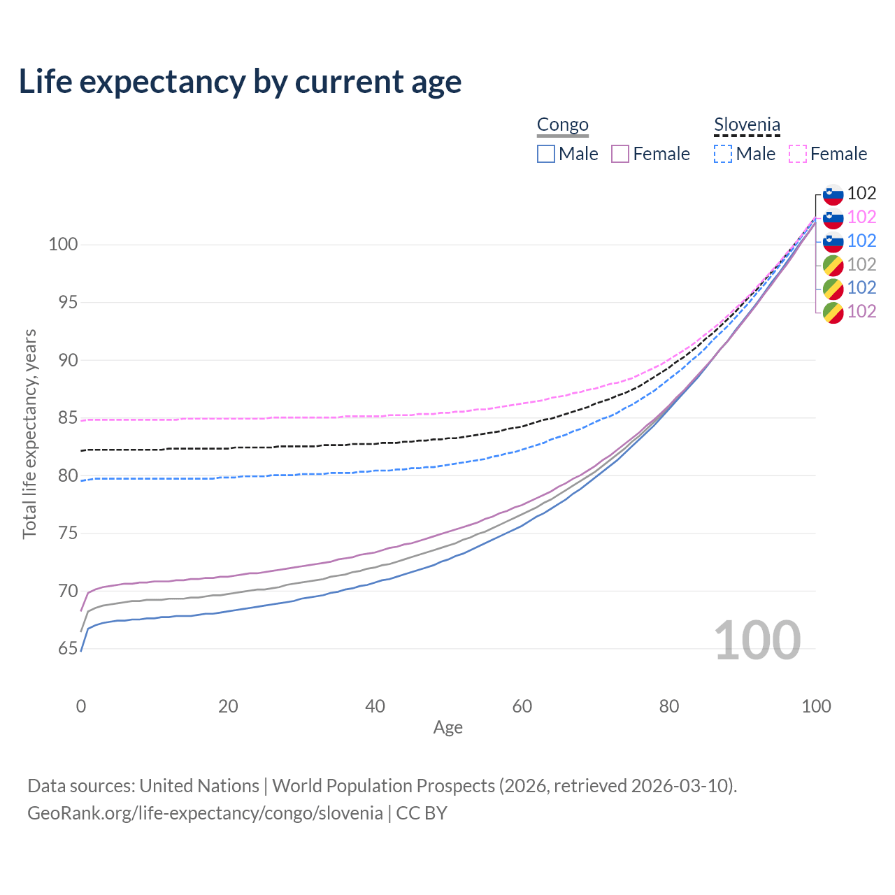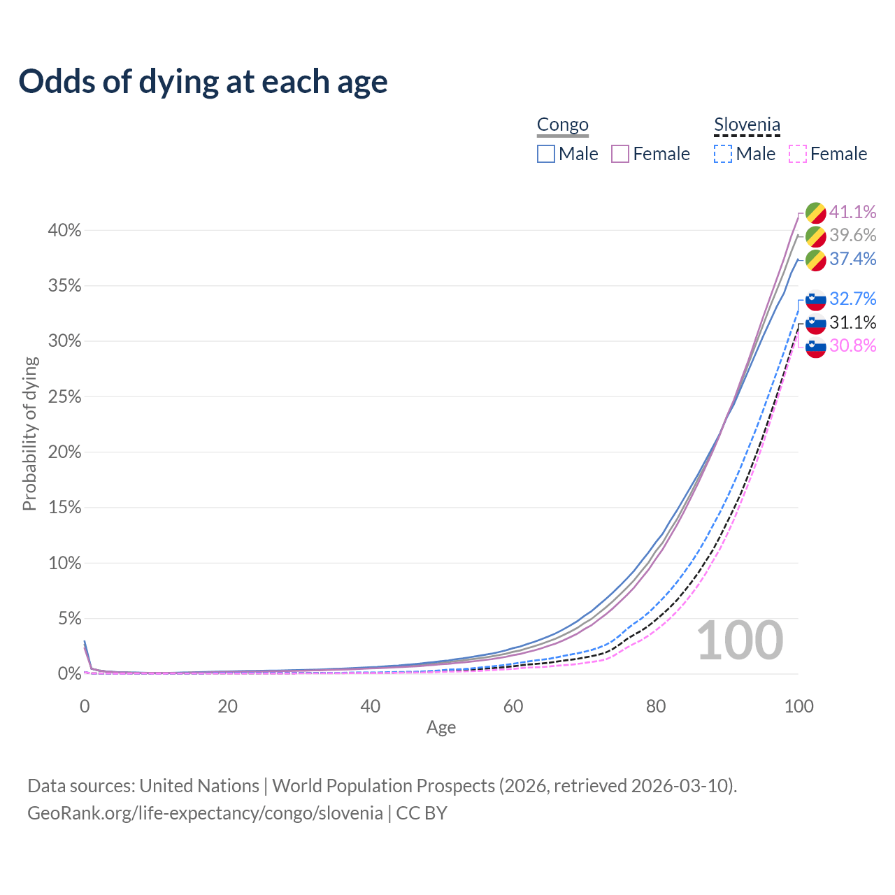 This life expectancy calculator shows the odds of living to 100, 95, 90, and below based on current age for both males and females in the Congo and Slovenia, along with mean and median age of death. The calculations are based on the 2026 life tables (actuarial tables) from the UN World Population Prospects.