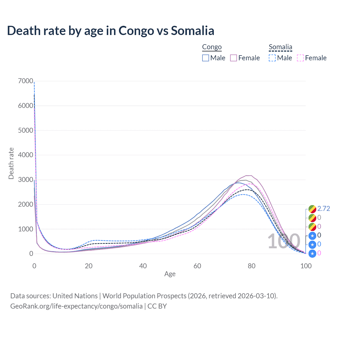 In the Congo, the most common age of death is 78, compared to 0 in Somalia. The median age of death is 71.8 in the Congo and 69 in Somalia, meaning only half of each cohort is expected to live past that age.