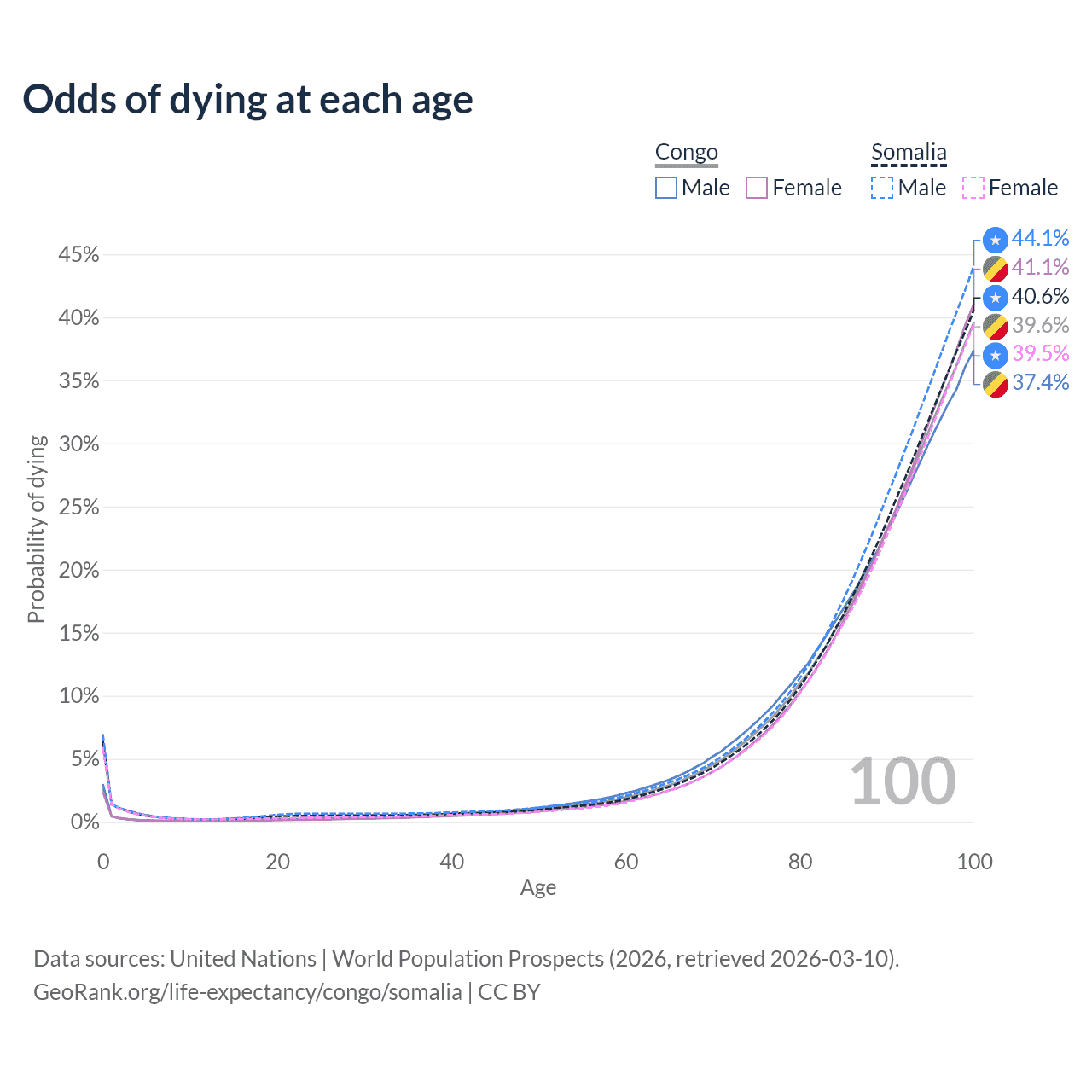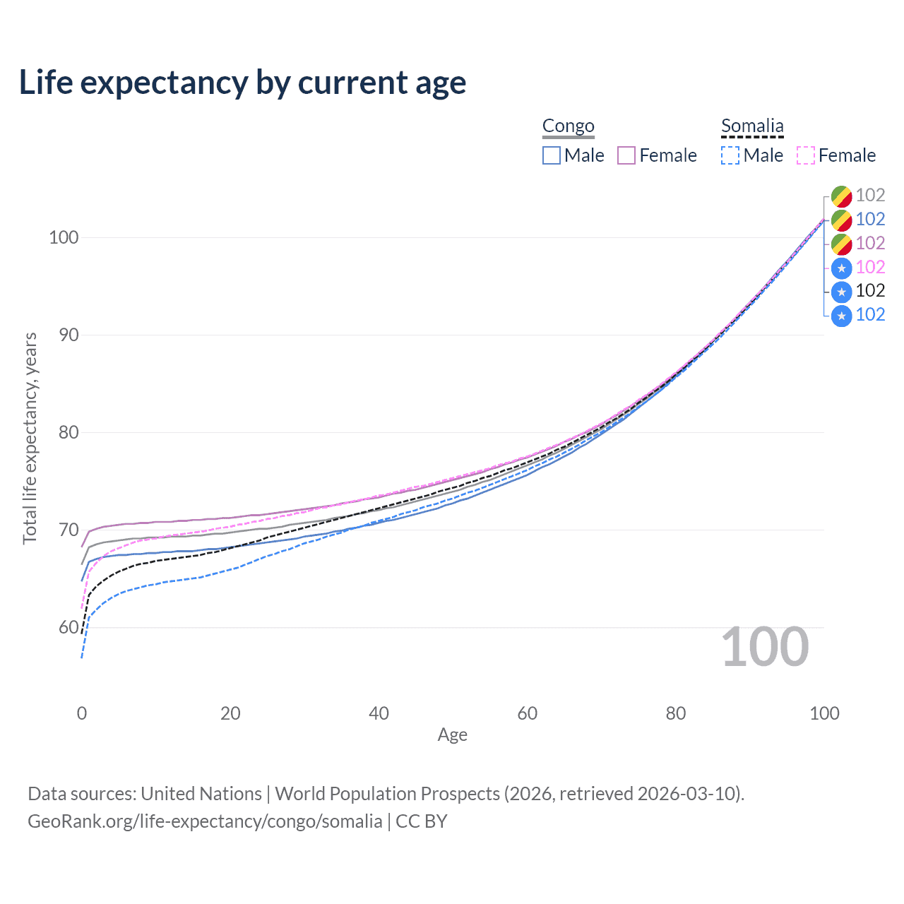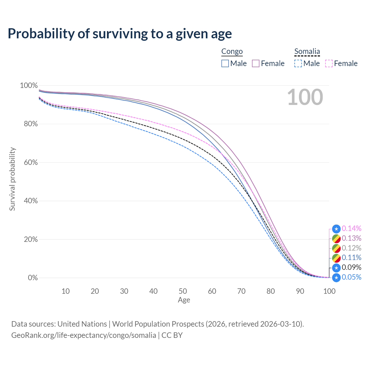 This life expectancy calculator shows the odds of living to 100, 95, 90, and below based on current age for both males and females in the Congo and Somalia, along with mean and median age of death. The calculations are based on the 2026 life tables (actuarial tables) from the UN World Population Prospects.