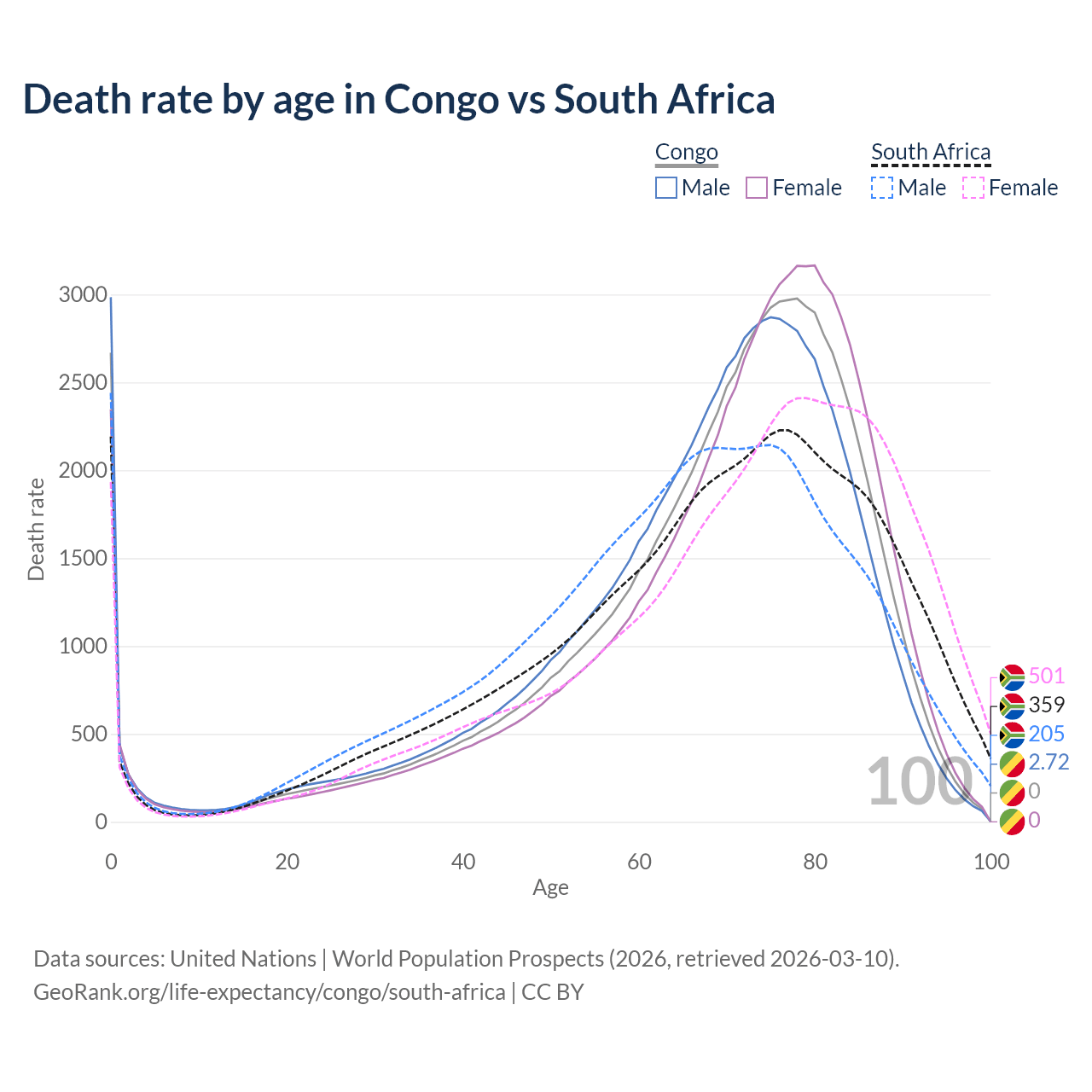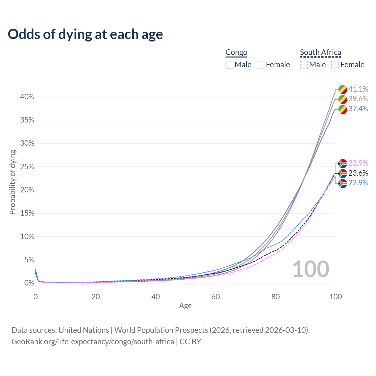 This life expectancy calculator shows the odds of living to 100, 95, 90, and below based on current age for both males and females in the Congo and South Africa, along with mean and median age of death. The calculations are based on the 2026 life tables (actuarial tables) from the UN World Population Prospects.