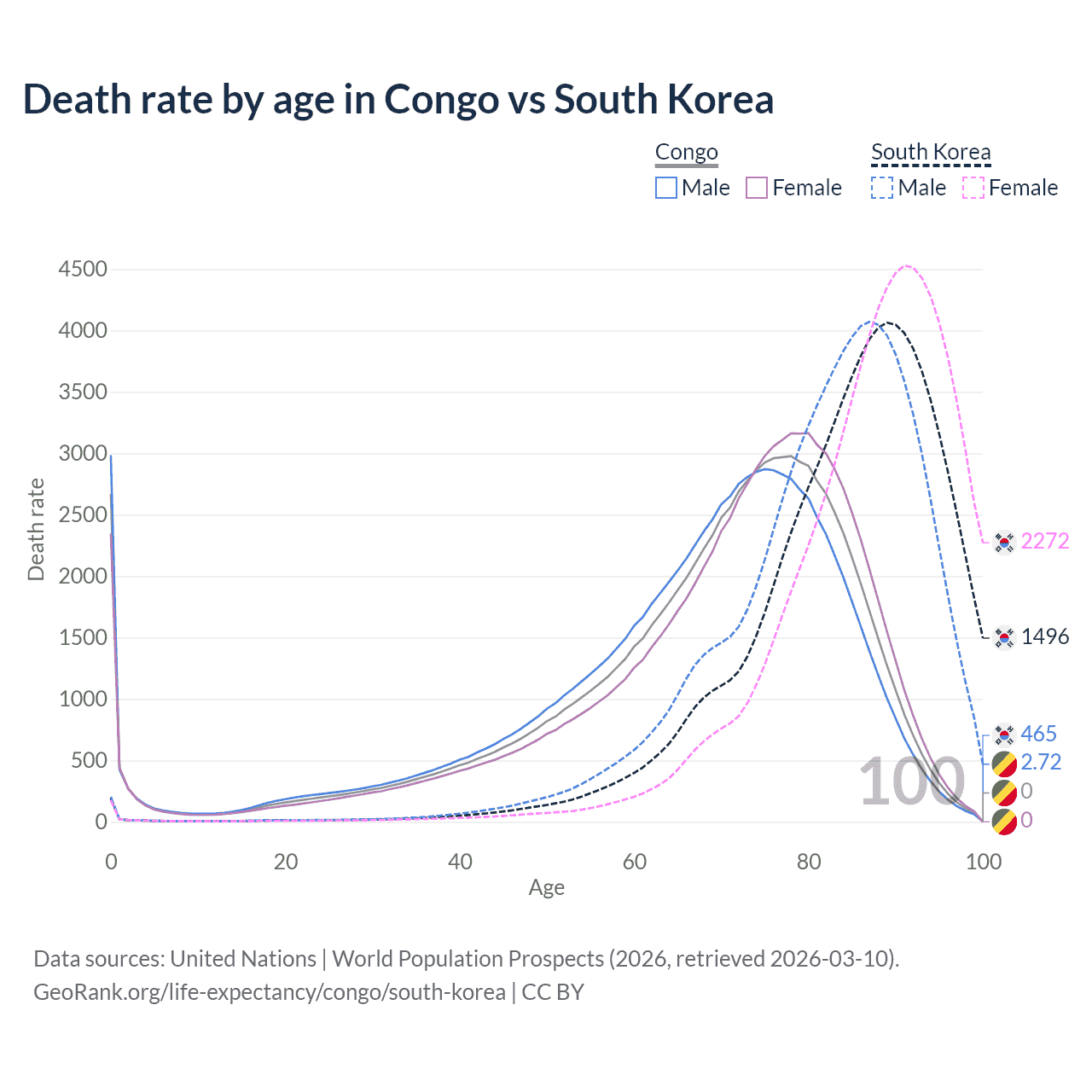 In the Congo, the most common age of death is 78, compared to 89 in South Korea. The median age of death is 71.8 in the Congo and 86.8 in South Korea, meaning only half of each cohort is expected to live past that age.