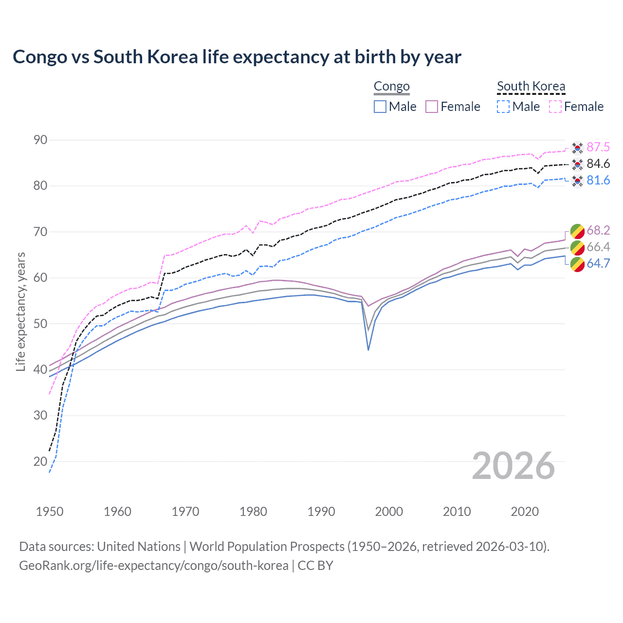 The average life expectancy at birth is 66.4 years in the Congo vs 84.6 in South Korea. The Congo is ranked 168/197 by life expectancy, and South Korea is 4/197. In the Congo, the life expectancy is 64.7 years for males and 68.2 years for females. In South Korea, it's 81.6 years for males and 87.5 years for females.