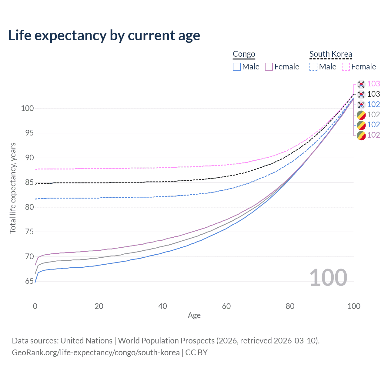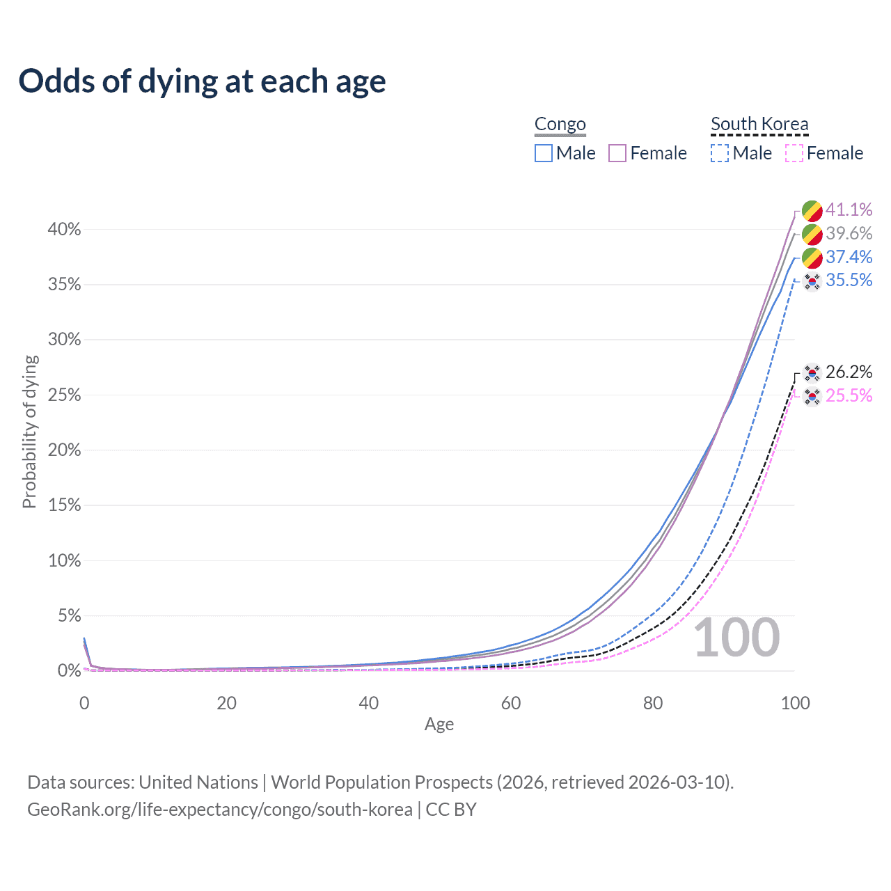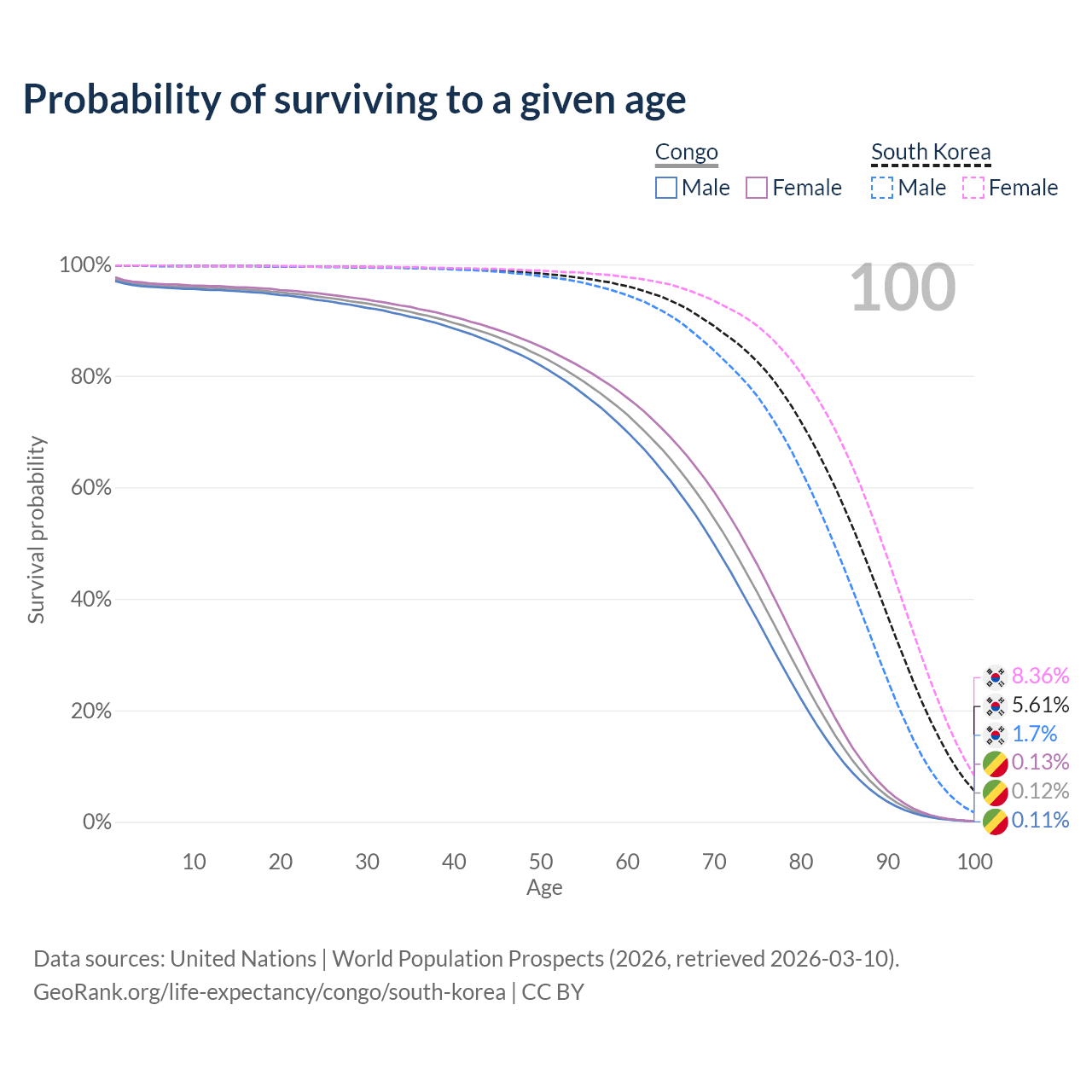 This life expectancy calculator shows the odds of living to 100, 95, 90, and below based on current age for both males and females in the Congo and South Korea, along with mean and median age of death. The calculations are based on the 2026 life tables (actuarial tables) from the UN World Population Prospects.