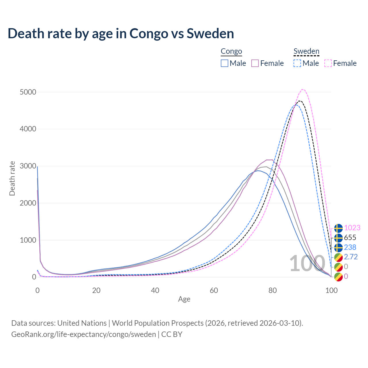 In the Congo, the most common age of death is 78, compared to 89 in Sweden. The median age of death is 71.8 in the Congo and 86.5 in Sweden, meaning only half of each cohort is expected to live past that age.