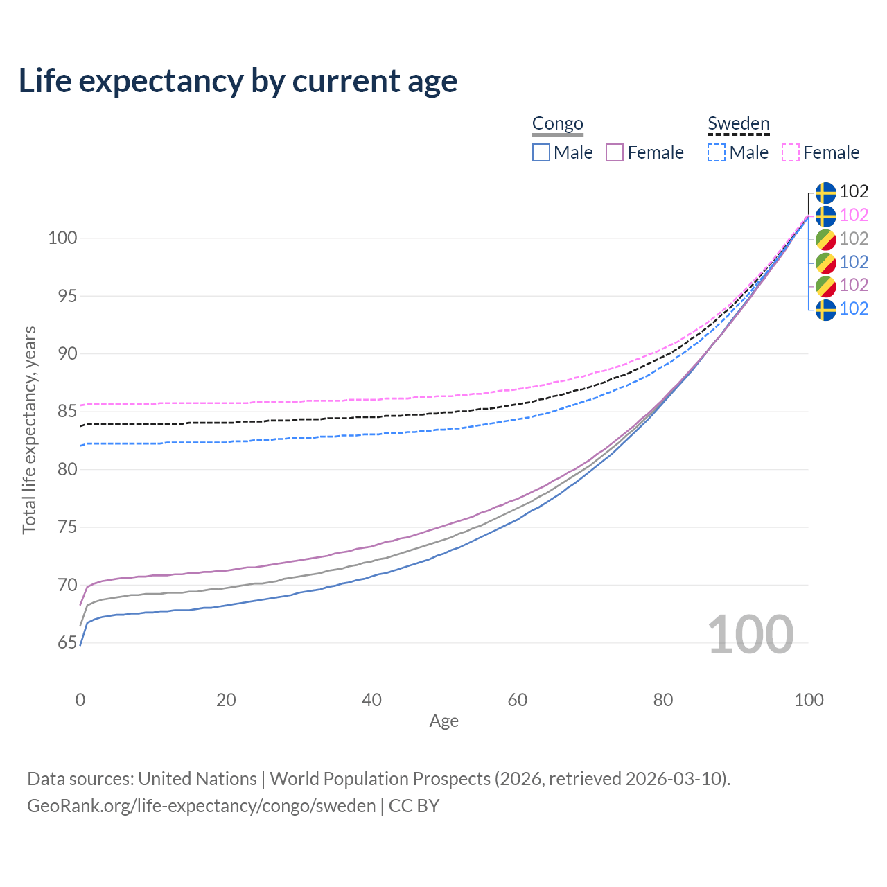 The average life expectancy at birth is 66.4 years in the Congo vs 83.7 in Sweden. The Congo is ranked 168/197 by life expectancy, and Sweden is 14/197. In the Congo, the life expectancy is 64.7 years for males and 68.2 years for females. In Sweden, it's 82 years for males and 85.5 years for females.