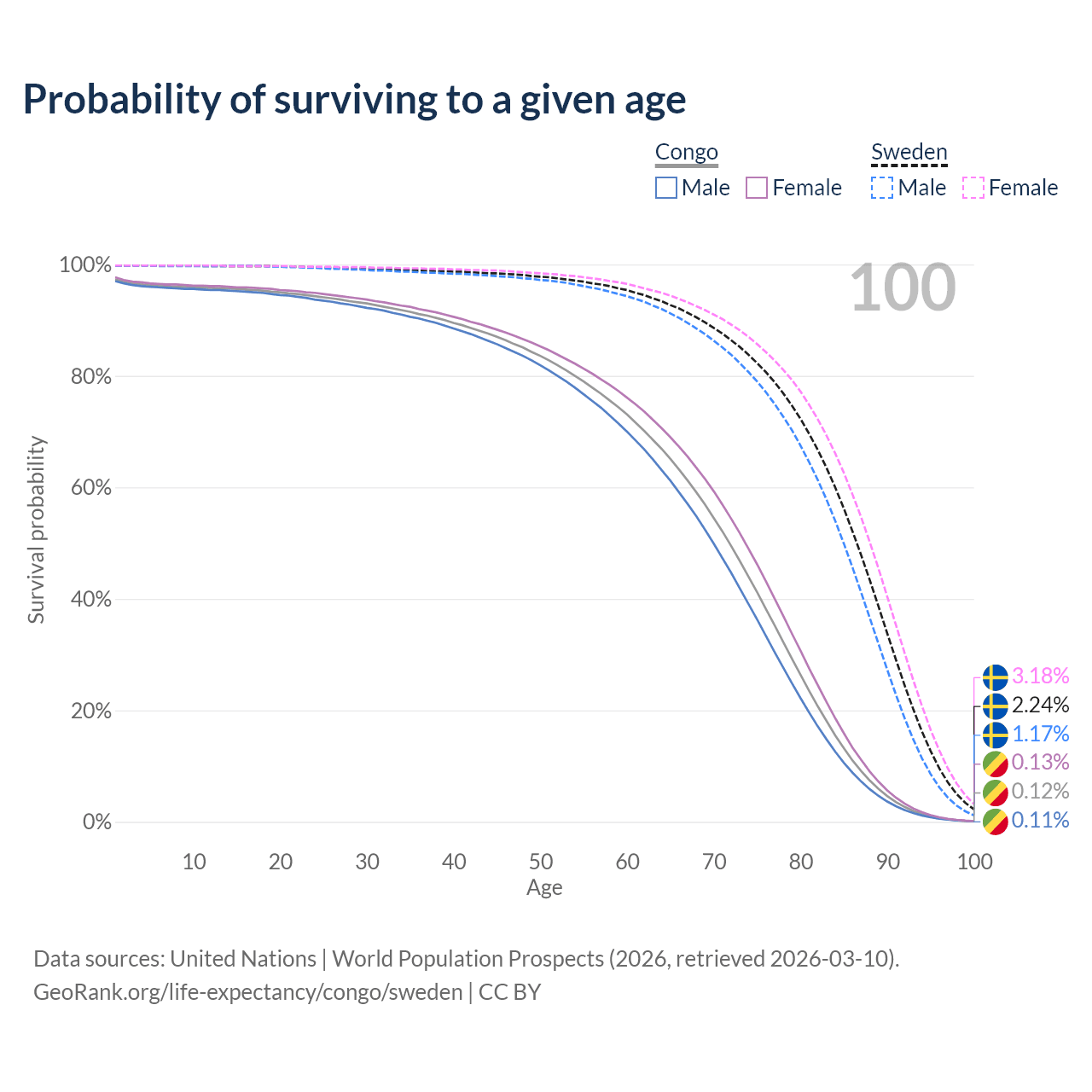 This life expectancy calculator shows the odds of living to 100, 95, 90, and below based on current age for both males and females in the Congo and Sweden, along with mean and median age of death. The calculations are based on the 2026 life tables (actuarial tables) from the UN World Population Prospects.