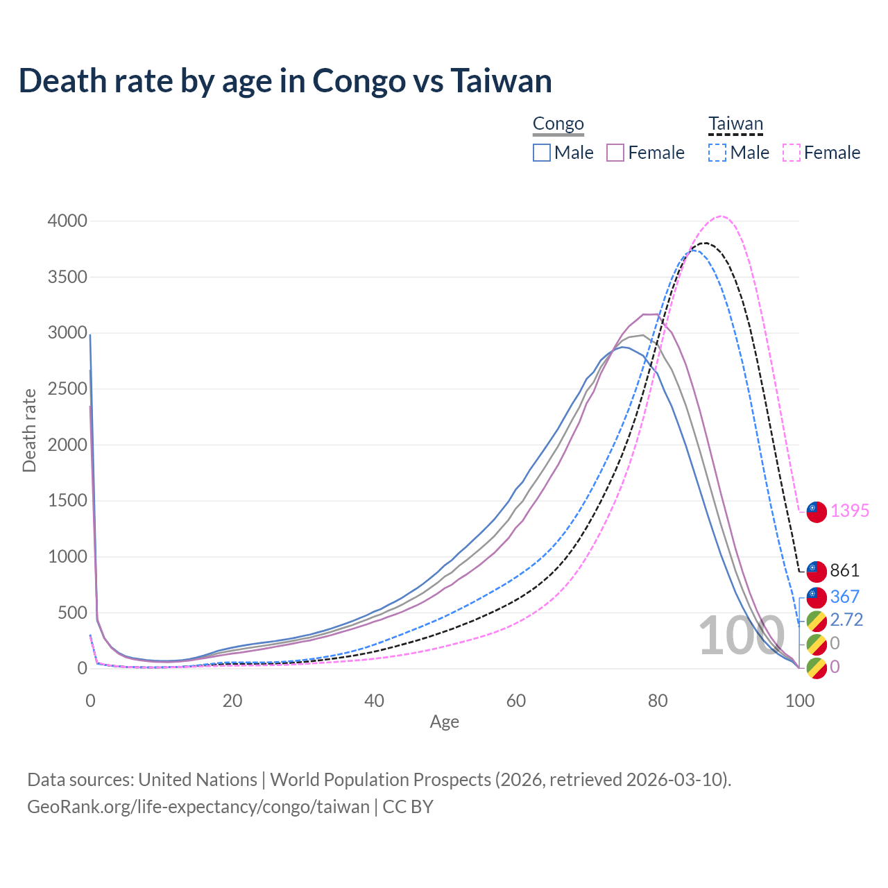 This life expectancy calculator shows the odds of living to 100, 95, 90, and below based on current age for both males and females in the Congo and Taiwan, along with mean and median age of death. The calculations are based on the 2026 life tables (actuarial tables) from the UN World Population Prospects.