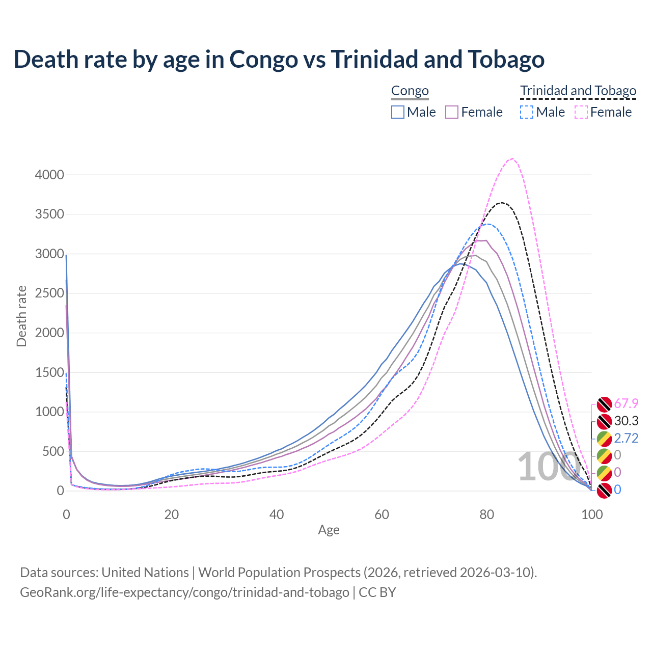 In the Congo, the most common age of death is 78, compared to 83 in Trinidad and Tobago. The median age of death is 71.8 in the Congo and 78.4 in Trinidad and Tobago, meaning only half of each cohort is expected to live past that age.