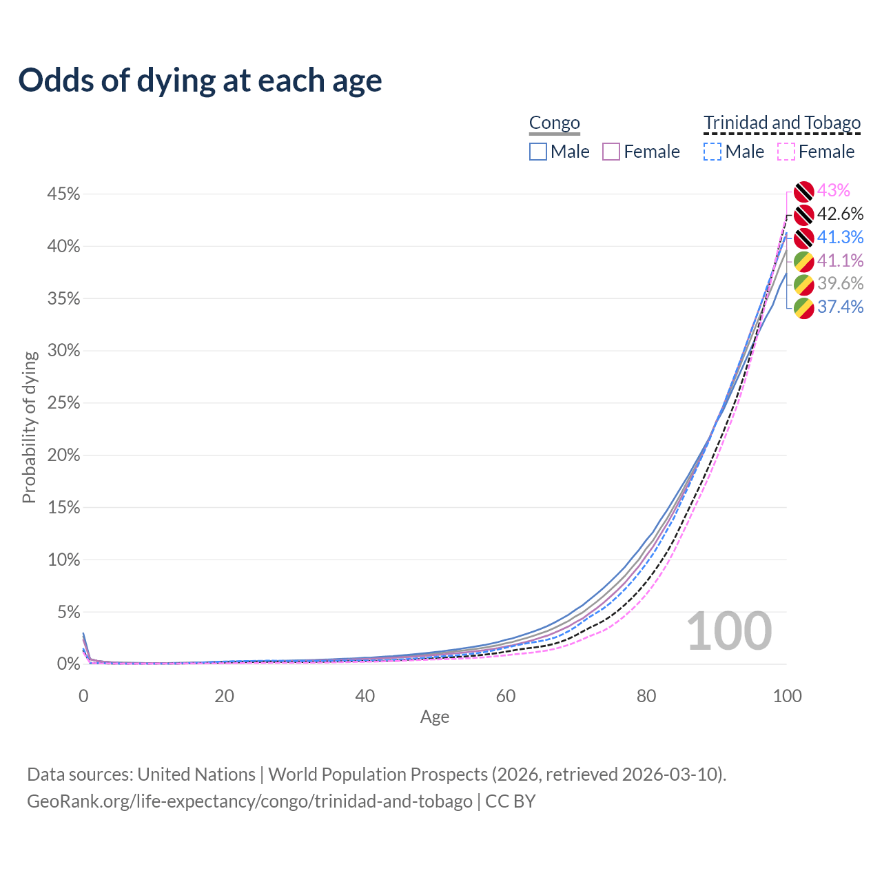 This life expectancy calculator shows the odds of living to 100, 95, 90, and below based on current age for both males and females in the Congo and Trinidad and Tobago, along with mean and median age of death. The calculations are based on the 2026 life tables (actuarial tables) from the UN World Population Prospects.