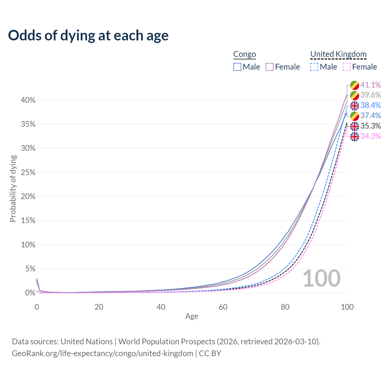 This life expectancy calculator shows the odds of living to 100, 95, 90, and below based on current age for both males and females in the Congo and the United Kingdom, along with mean and median age of death. The calculations are based on the 2026 life tables (actuarial tables) from the UN World Population Prospects.
