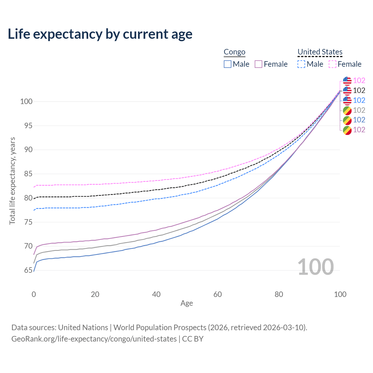 This life expectancy calculator shows the odds of living to 100, 95, 90, and below based on current age for both males and females in the Congo and the United States, along with mean and median age of death. The calculations are based on the 2026 life tables (actuarial tables) from the UN World Population Prospects.