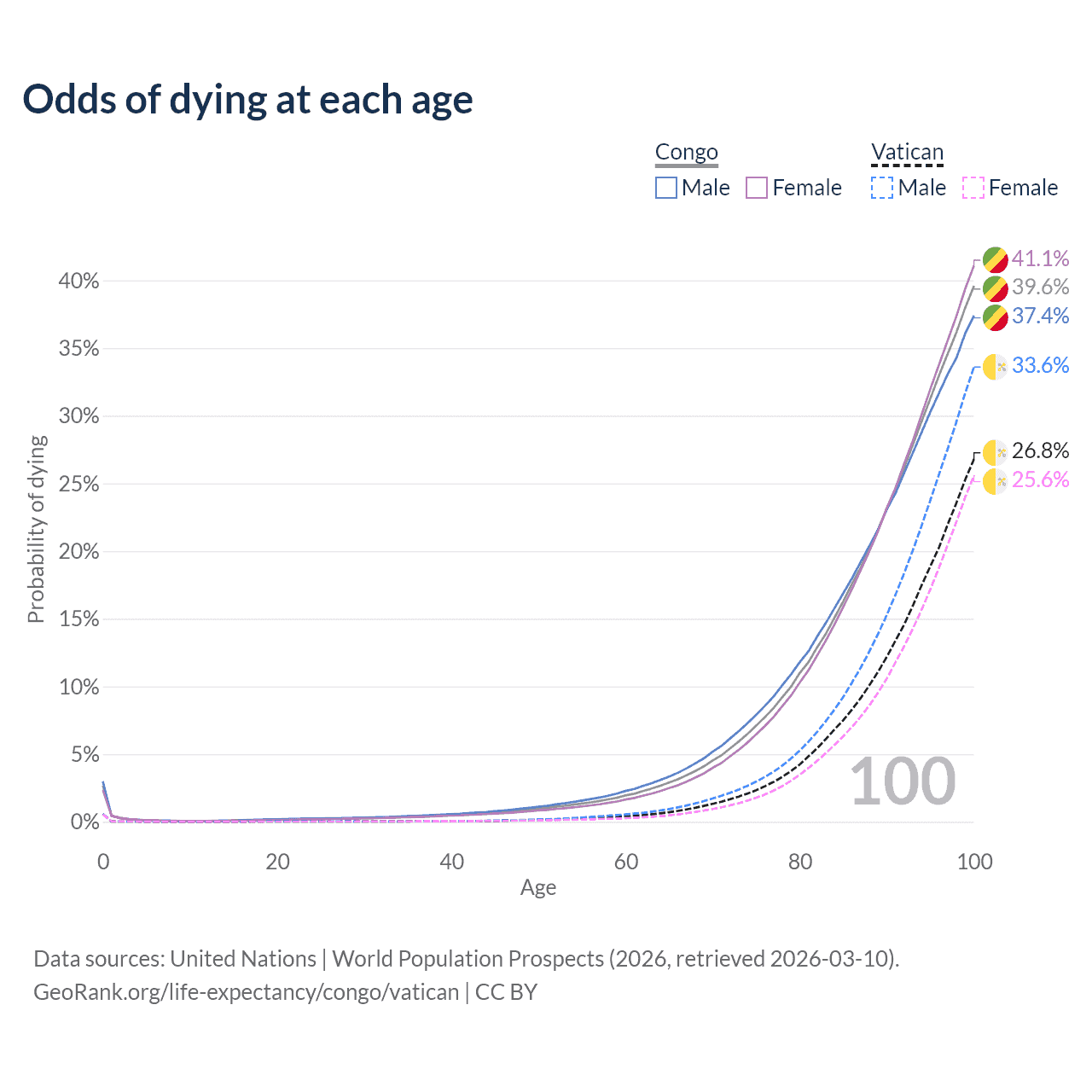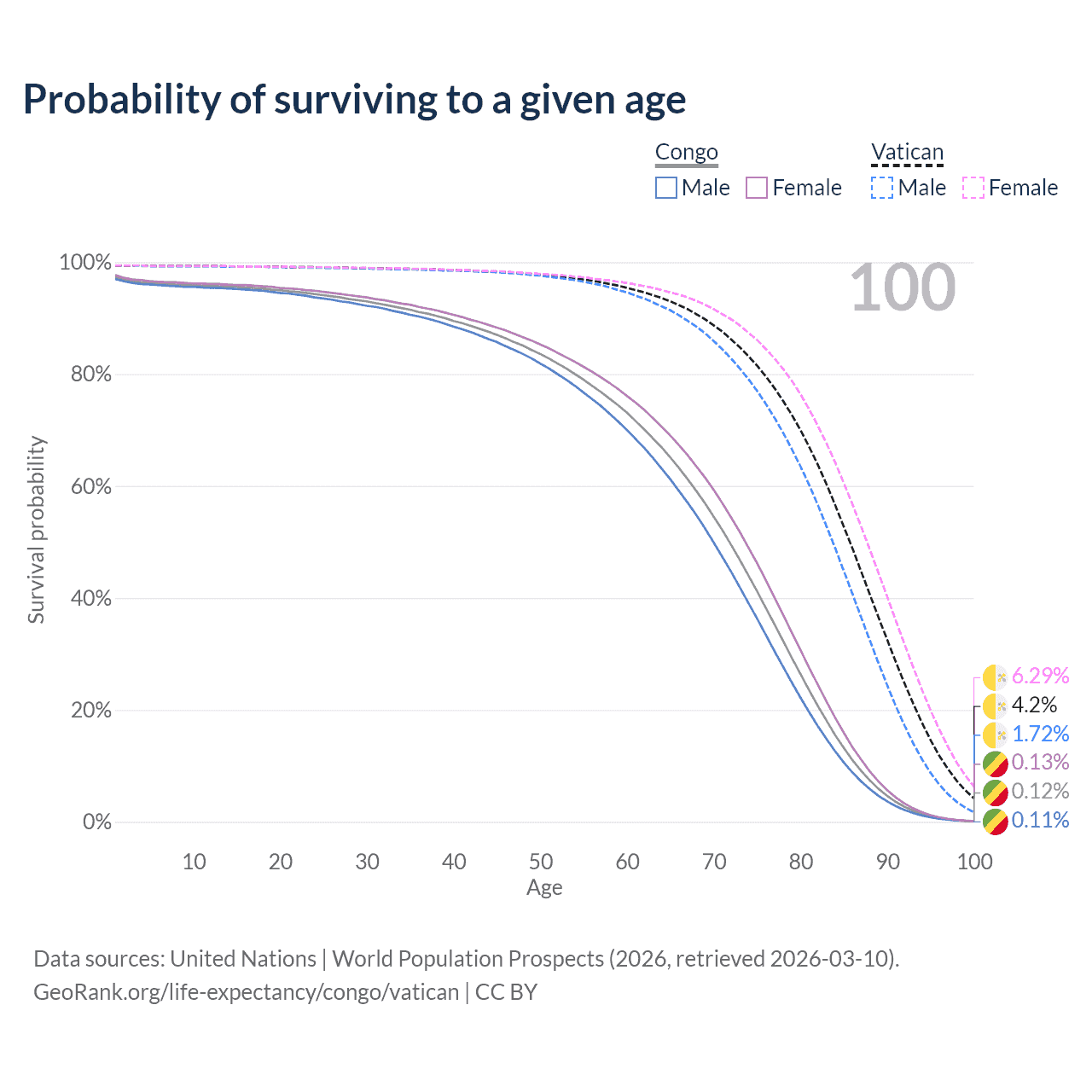 This life expectancy calculator shows the odds of living to 100, 95, 90, and below based on current age for both males and females in the Congo and the Vatican, along with mean and median age of death. The calculations are based on the 2026 life tables (actuarial tables) from the UN World Population Prospects.