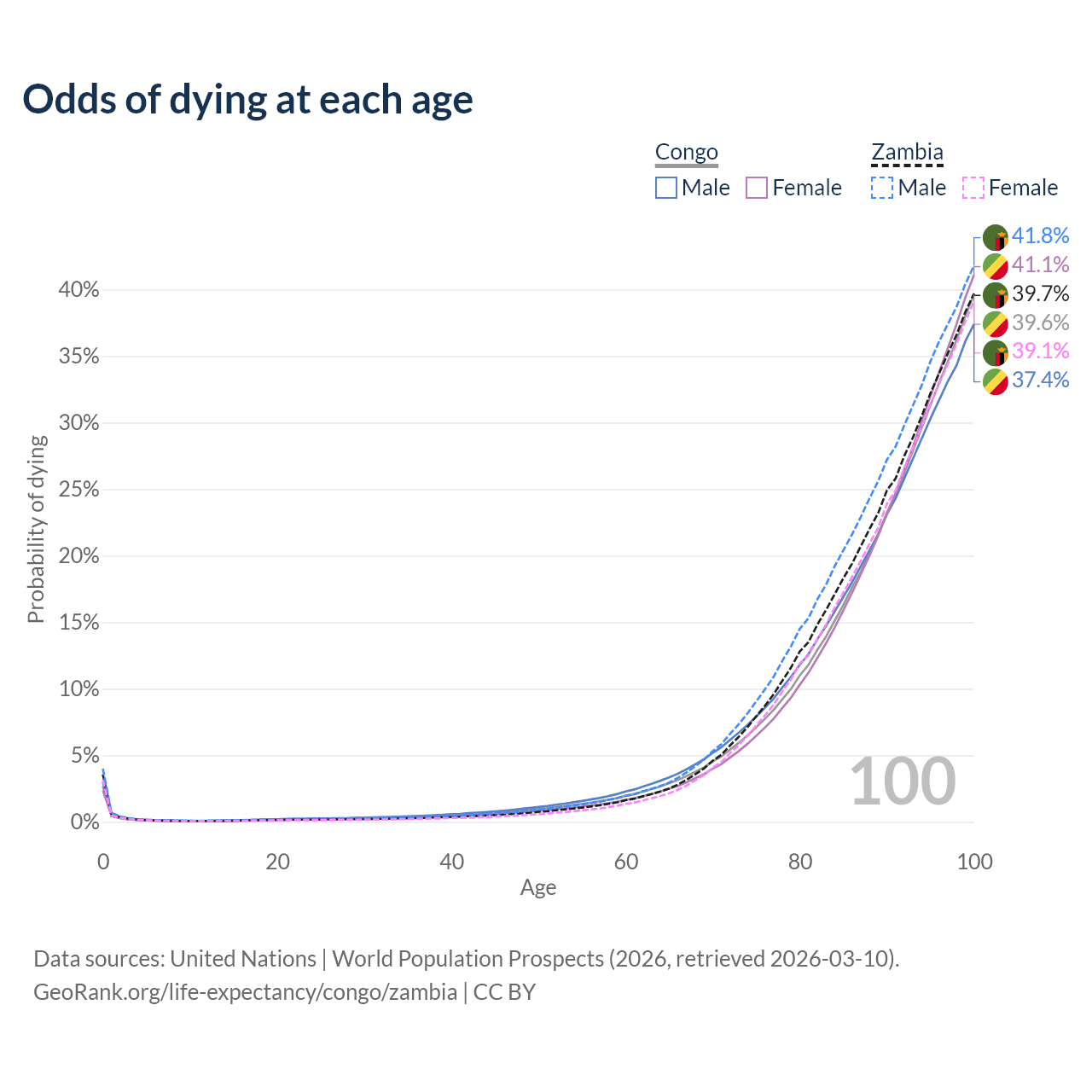 This life expectancy calculator shows the odds of living to 100, 95, 90, and below based on current age for both males and females in the Congo and Zambia, along with mean and median age of death. The calculations are based on the 2026 life tables (actuarial tables) from the UN World Population Prospects.