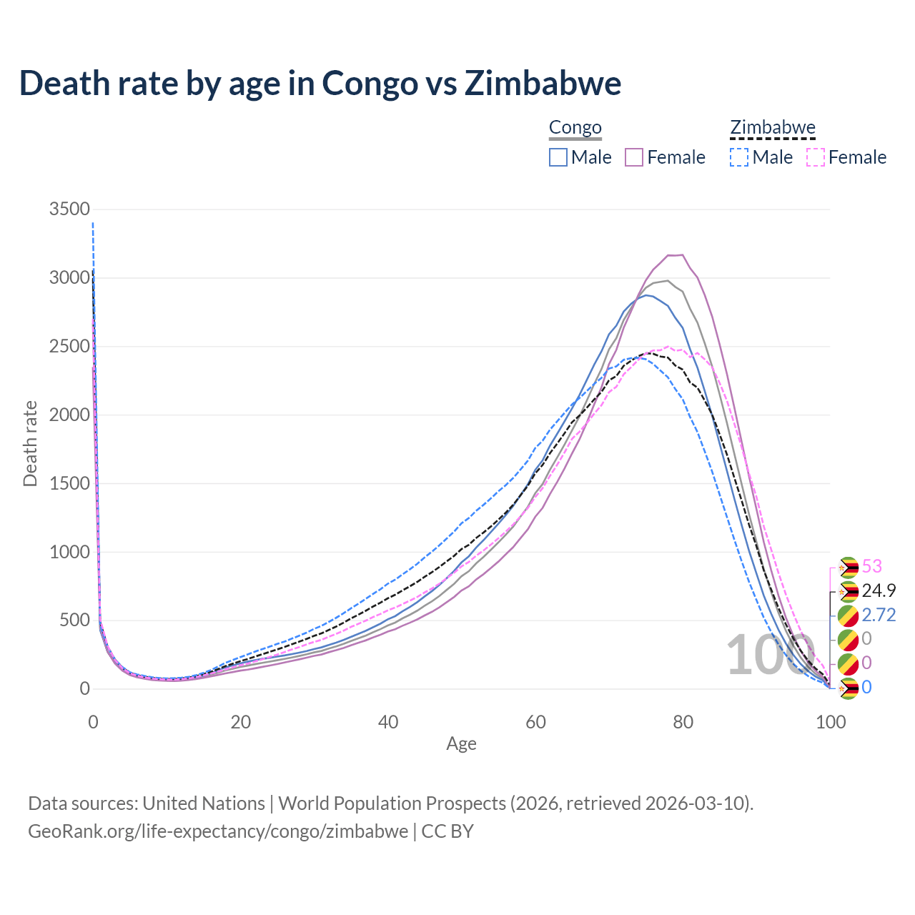 In the Congo, the most common age of death is 78, compared to 0 in Zimbabwe. The median age of death is 71.8 in the Congo and 68.8 in Zimbabwe, meaning only half of each cohort is expected to live past that age.