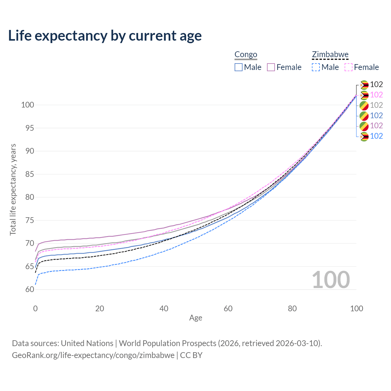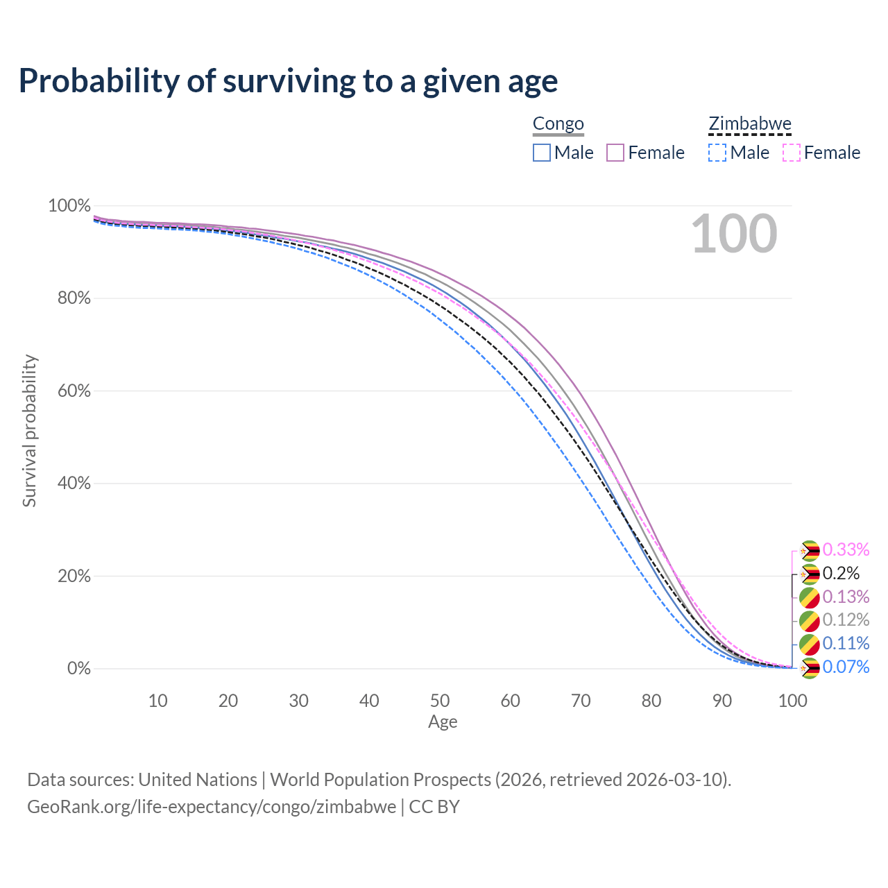 This life expectancy calculator shows the odds of living to 100, 95, 90, and below based on current age for both males and females in the Congo and Zimbabwe, along with mean and median age of death. The calculations are based on the 2026 life tables (actuarial tables) from the UN World Population Prospects.