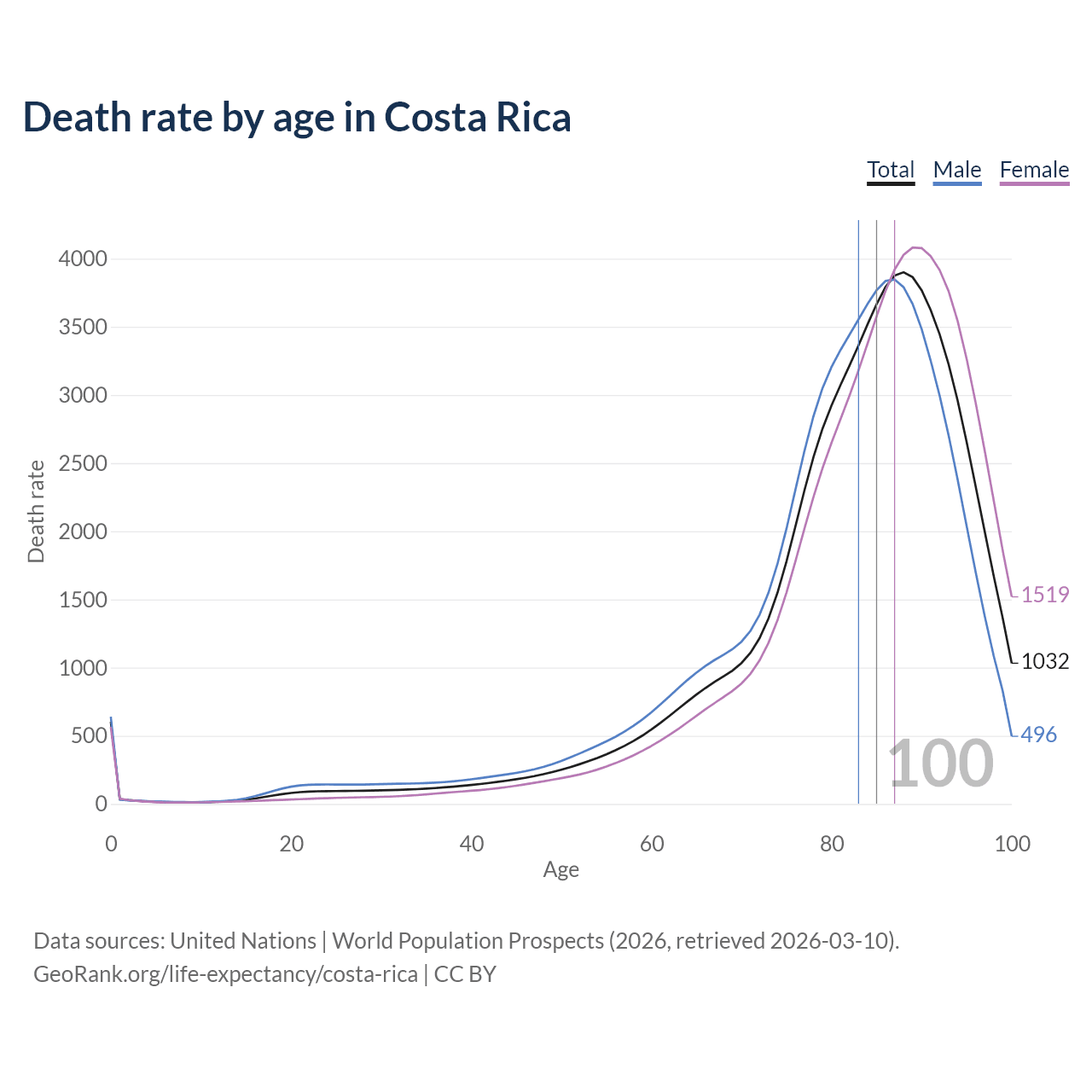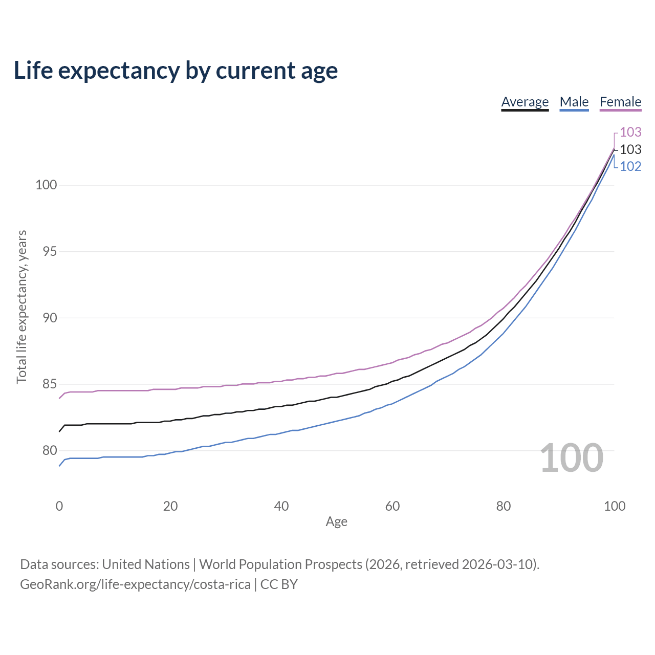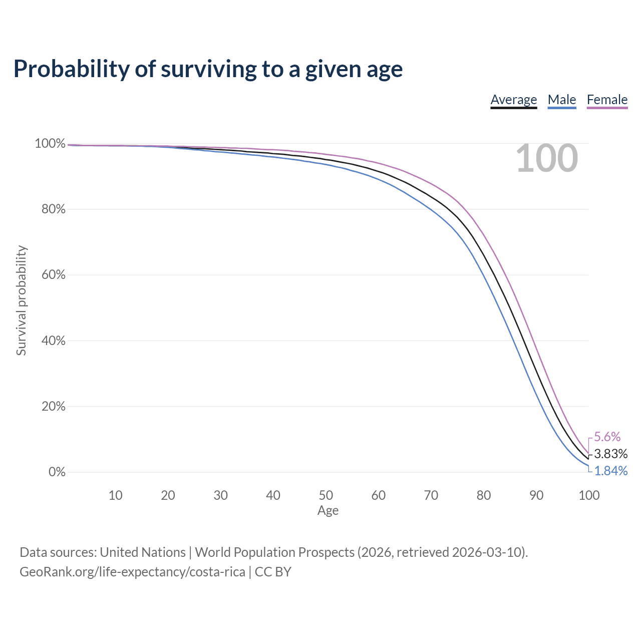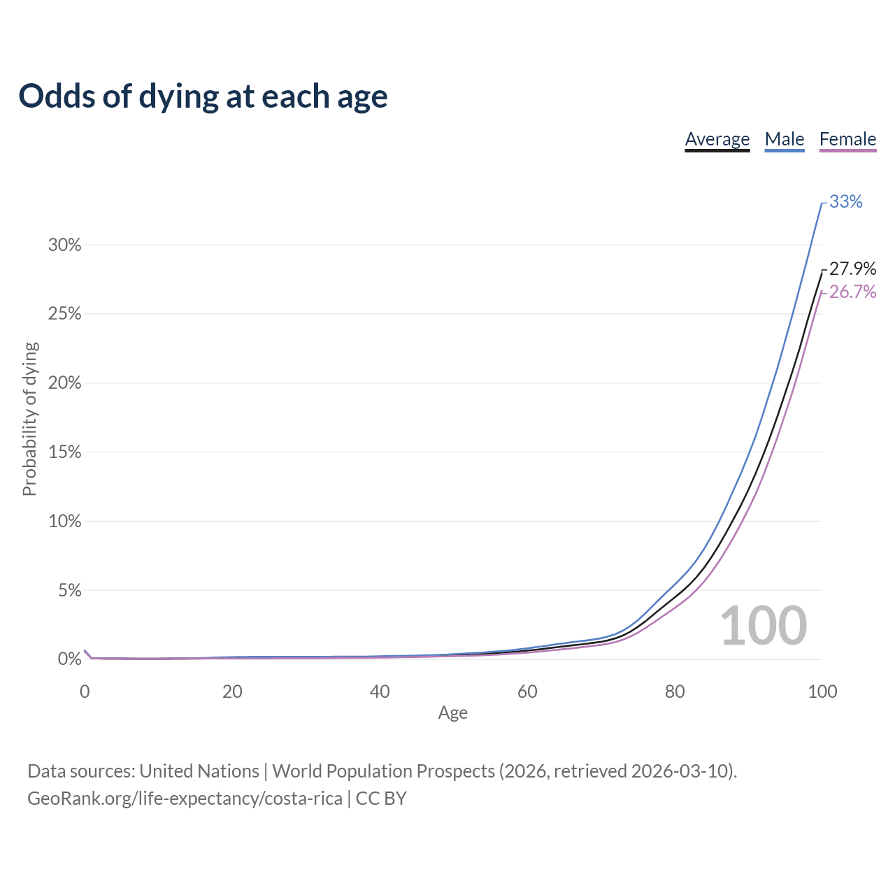 This life expectancy calculator shows the odds of living to 100, 95, 90, and below based on current age for both males and females in Costa Rica, along with mean and median age of death. The calculations are based on the 2026 life tables (actuarial tables) from the UN World Population Prospects.