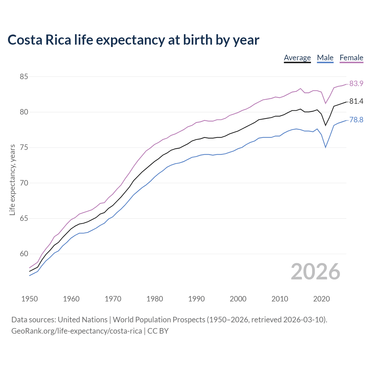 Costa Rica ranks 39/197 for average life expectancy at birth, with 78.8 years for males, 83.9 years for females, and 81.4 years for both sexes combined.