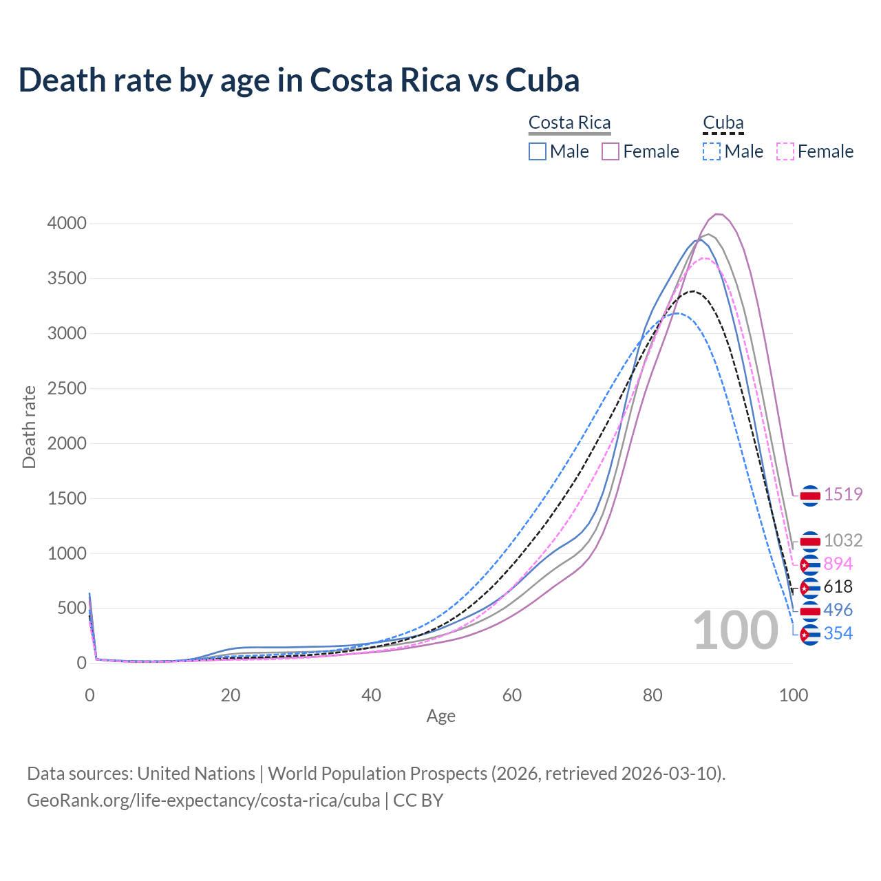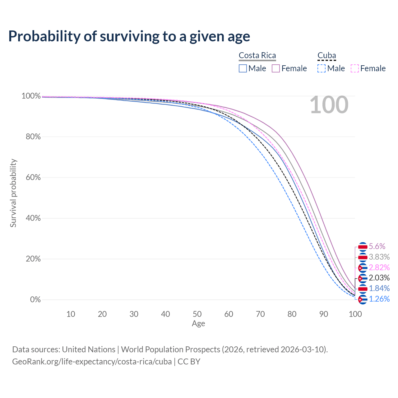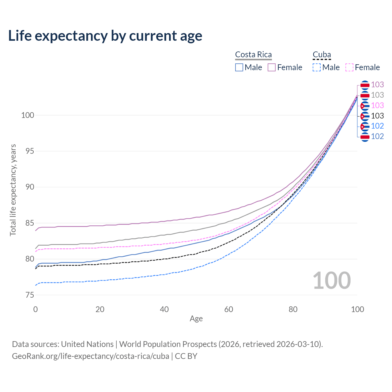 This life expectancy calculator shows the odds of living to 100, 95, 90, and below based on current age for both males and females in Costa Rica and Cuba, along with mean and median age of death. The calculations are based on the 2026 life tables (actuarial tables) from the UN World Population Prospects.