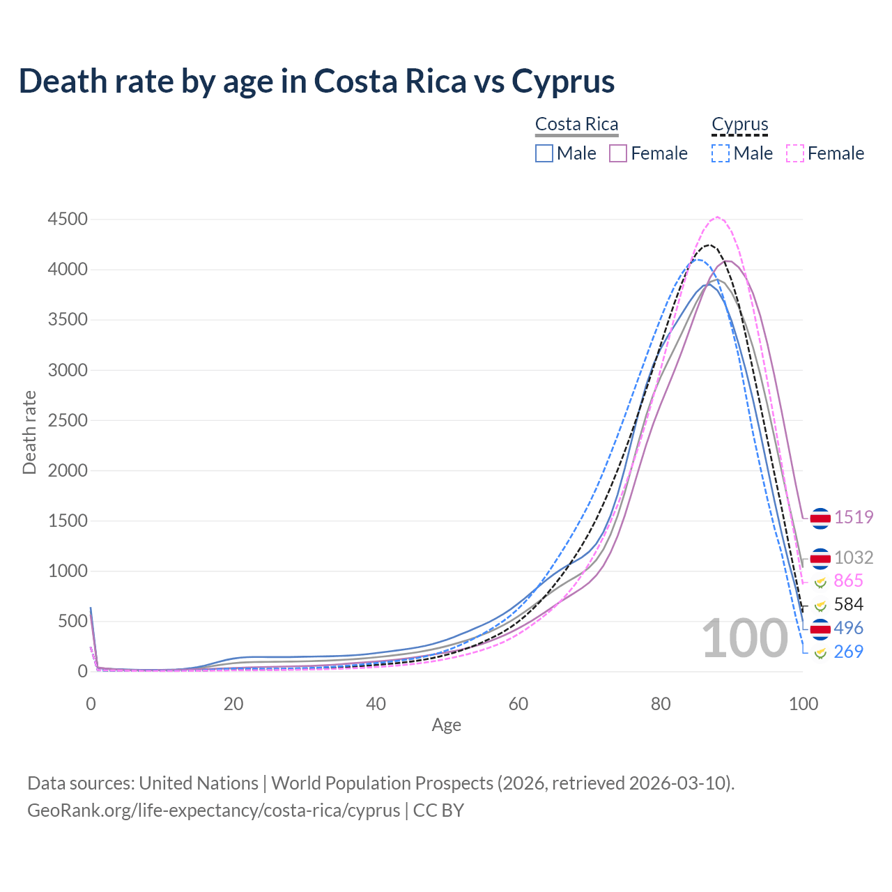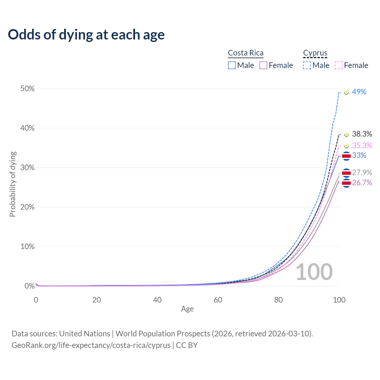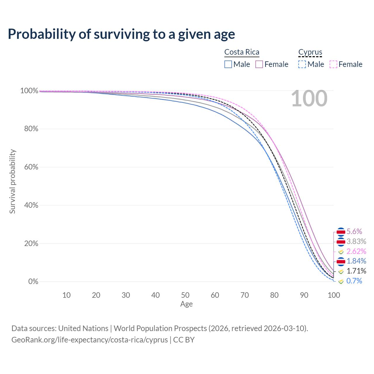 This life expectancy calculator shows the odds of living to 100, 95, 90, and below based on current age for both males and females in Costa Rica and Cyprus, along with mean and median age of death. The calculations are based on the 2026 life tables (actuarial tables) from the UN World Population Prospects.