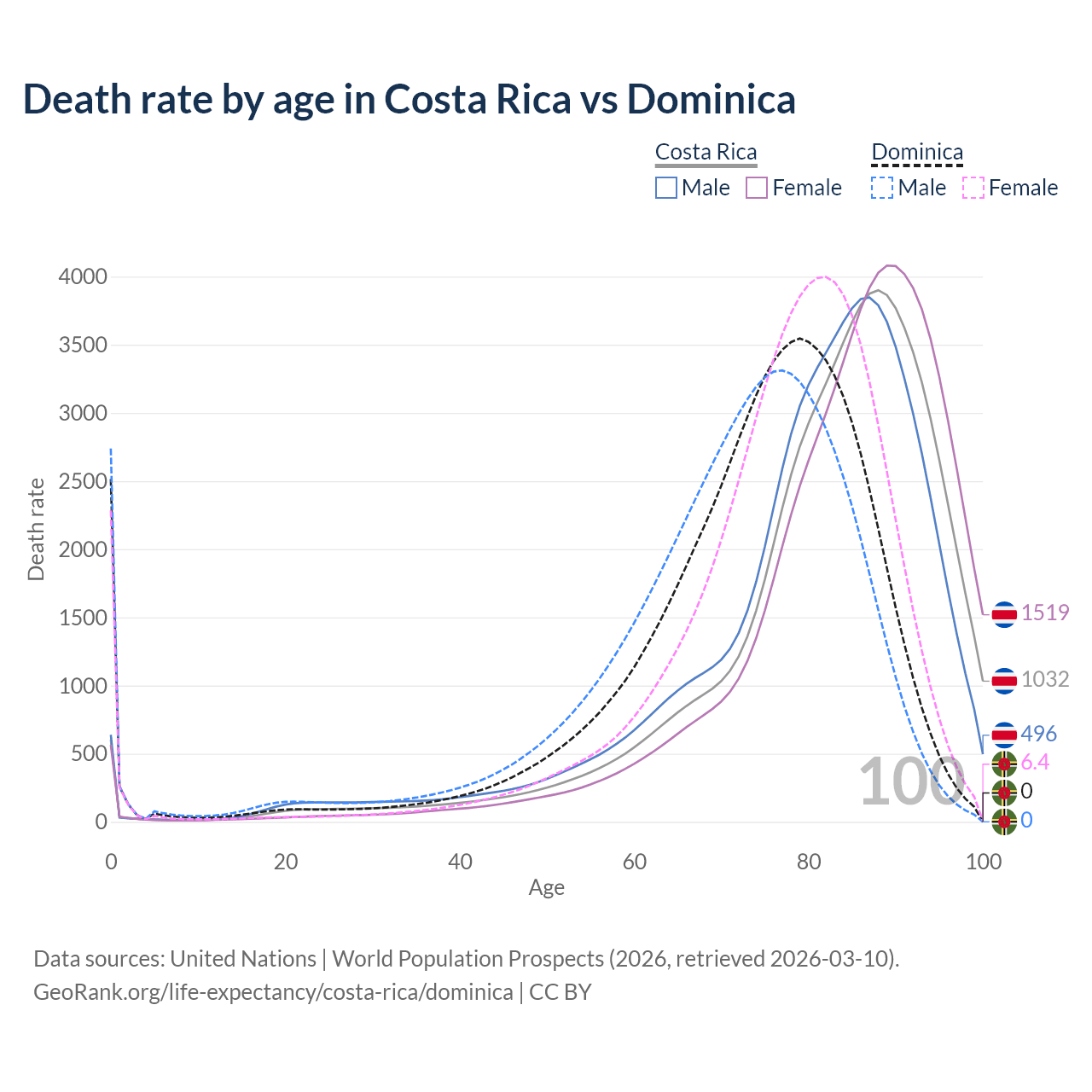 In Costa Rica, the most common age of death is 88, compared to 79 in Dominica. The median age of death is 85 in Costa Rica and 75.9 in Dominica, meaning only half of each cohort is expected to live past that age.