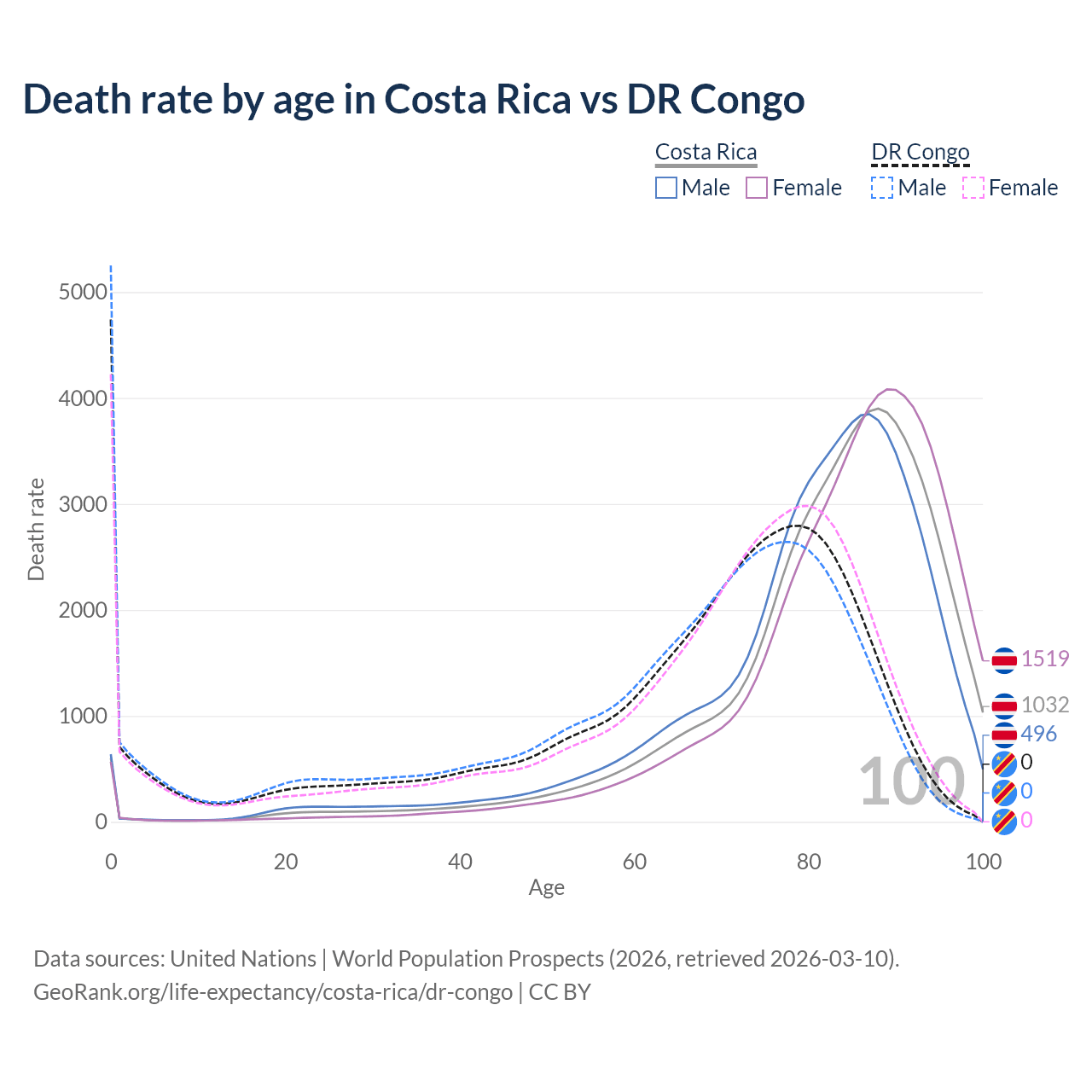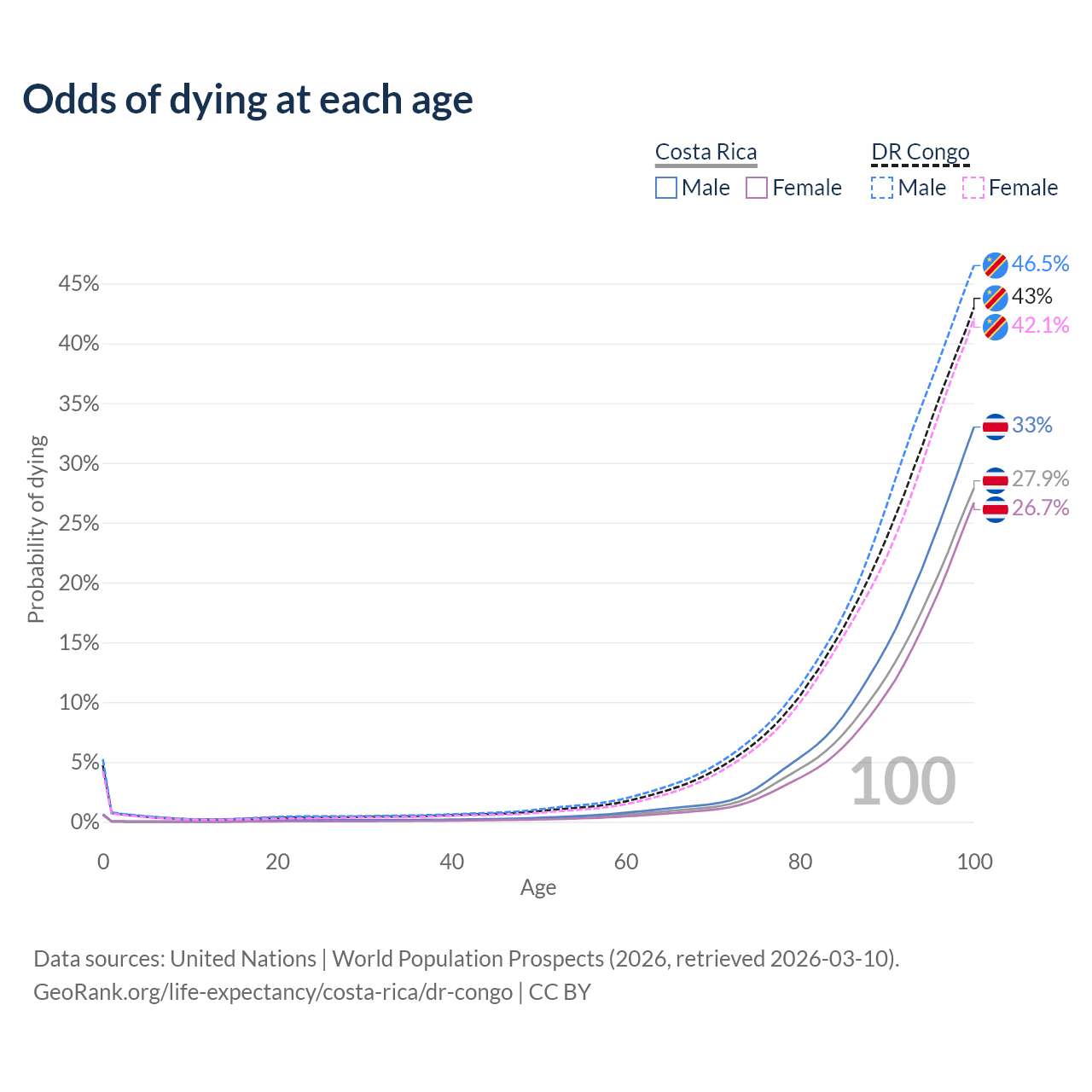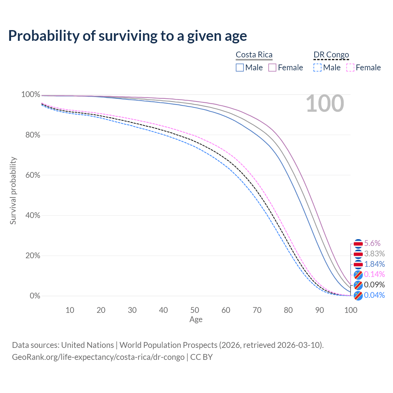 This life expectancy calculator shows the odds of living to 100, 95, 90, and below based on current age for both males and females in Costa Rica and the DR Congo, along with mean and median age of death. The calculations are based on the 2026 life tables (actuarial tables) from the UN World Population Prospects.