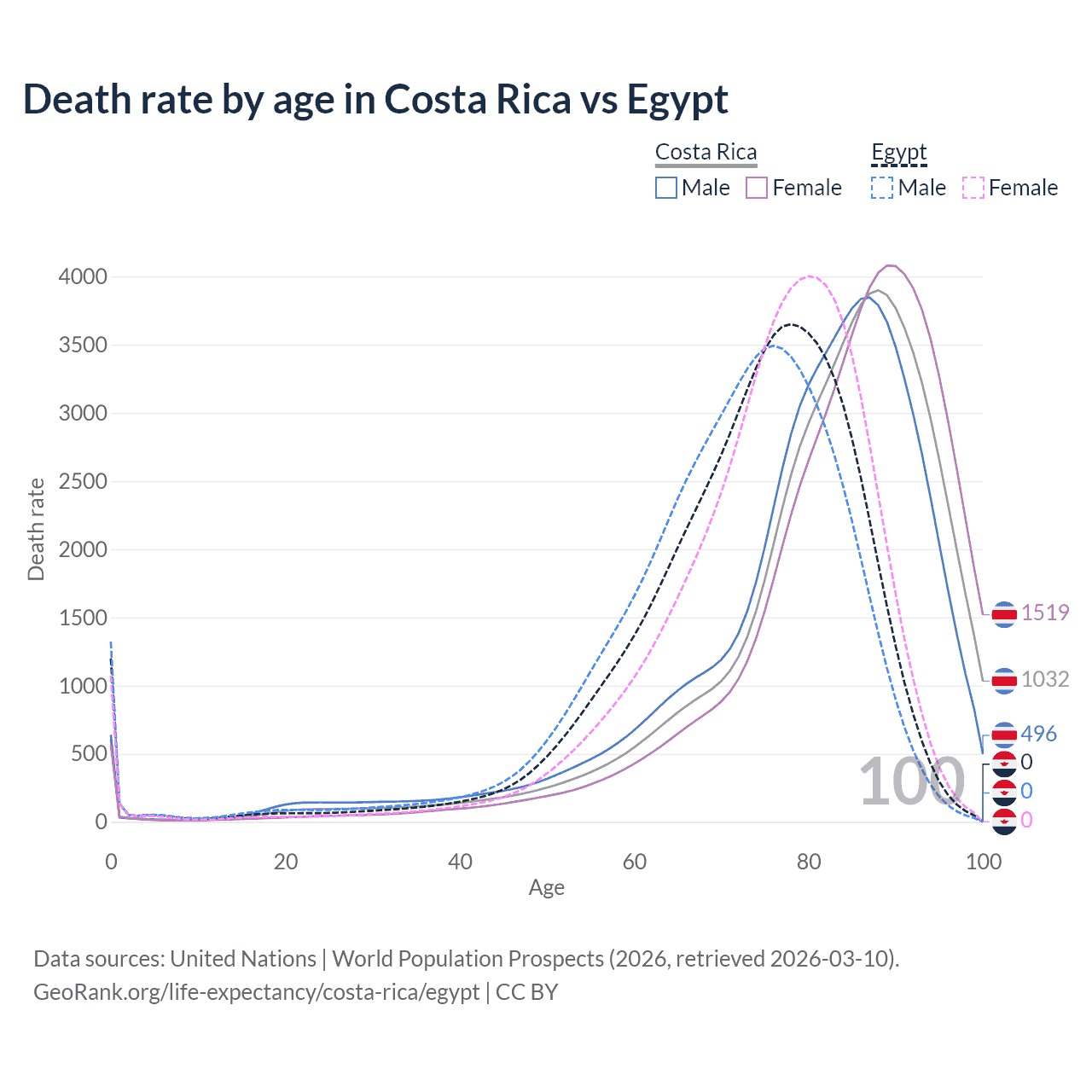 In Costa Rica, the most common age of death is 88, compared to 78 in Egypt. The median age of death is 85 in Costa Rica and 75.2 in Egypt, meaning only half of each cohort is expected to live past that age.