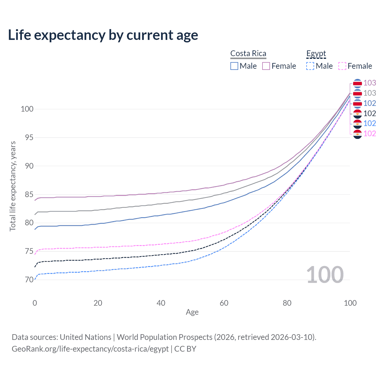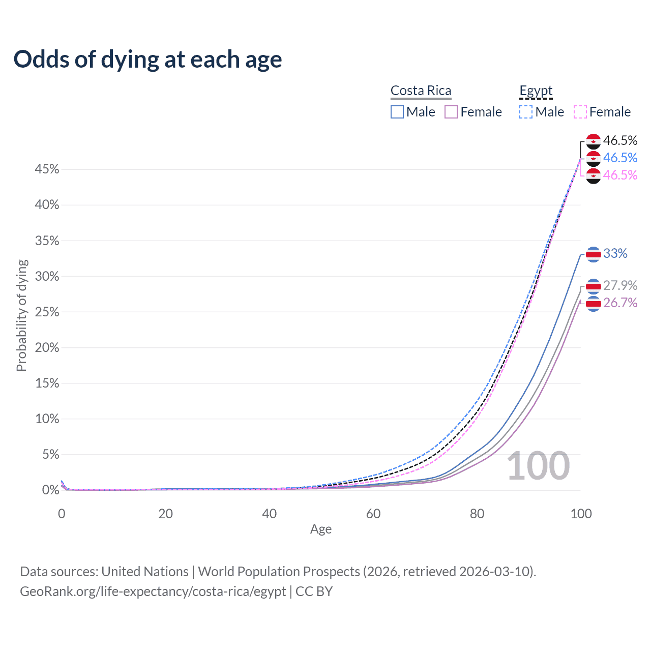 This life expectancy calculator shows the odds of living to 100, 95, 90, and below based on current age for both males and females in Costa Rica and Egypt, along with mean and median age of death. The calculations are based on the 2026 life tables (actuarial tables) from the UN World Population Prospects.