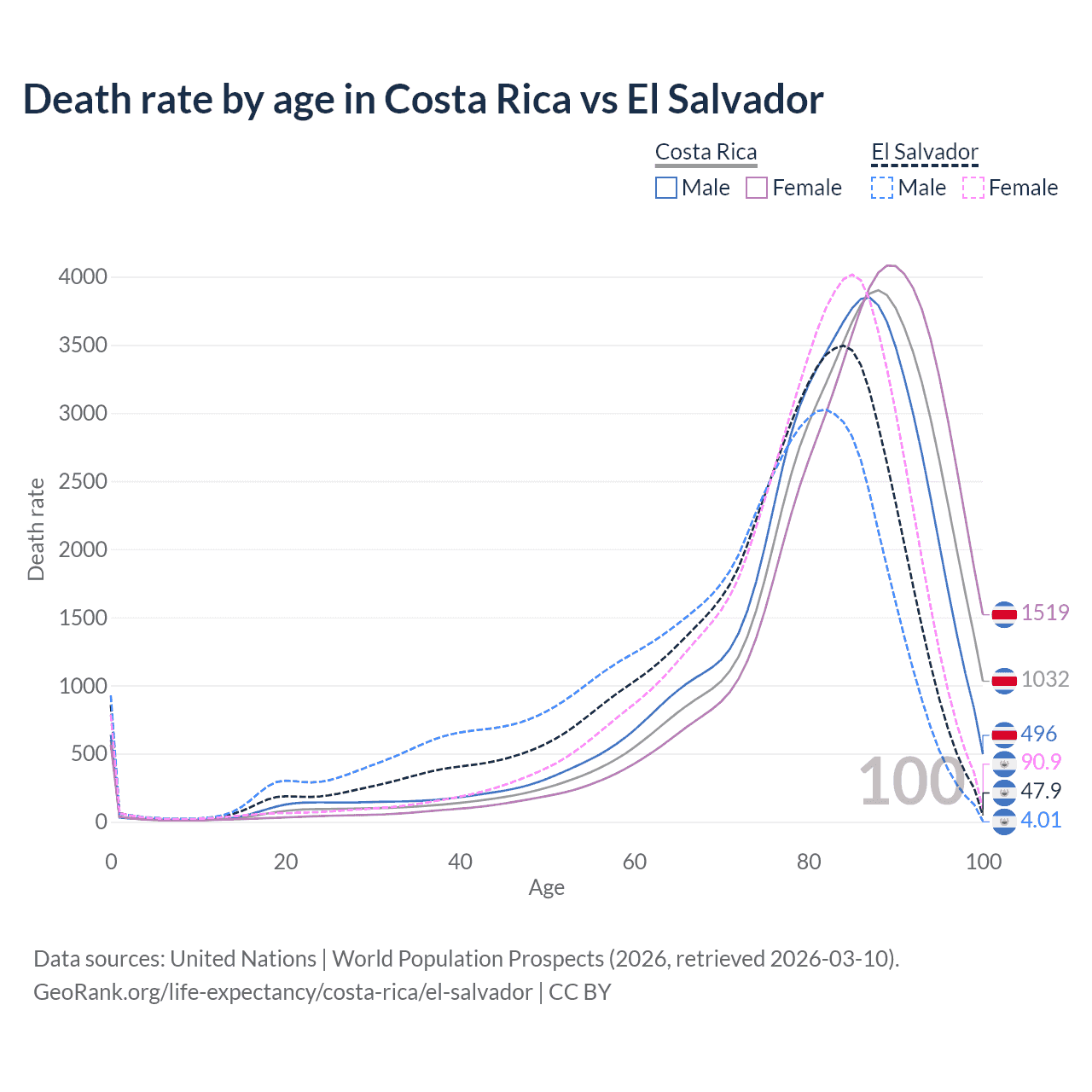 In Costa Rica, the most common age of death is 88, compared to 84 in El Salvador. The median age of death is 85 in Costa Rica and 78.1 in El Salvador, meaning only half of each cohort is expected to live past that age.
