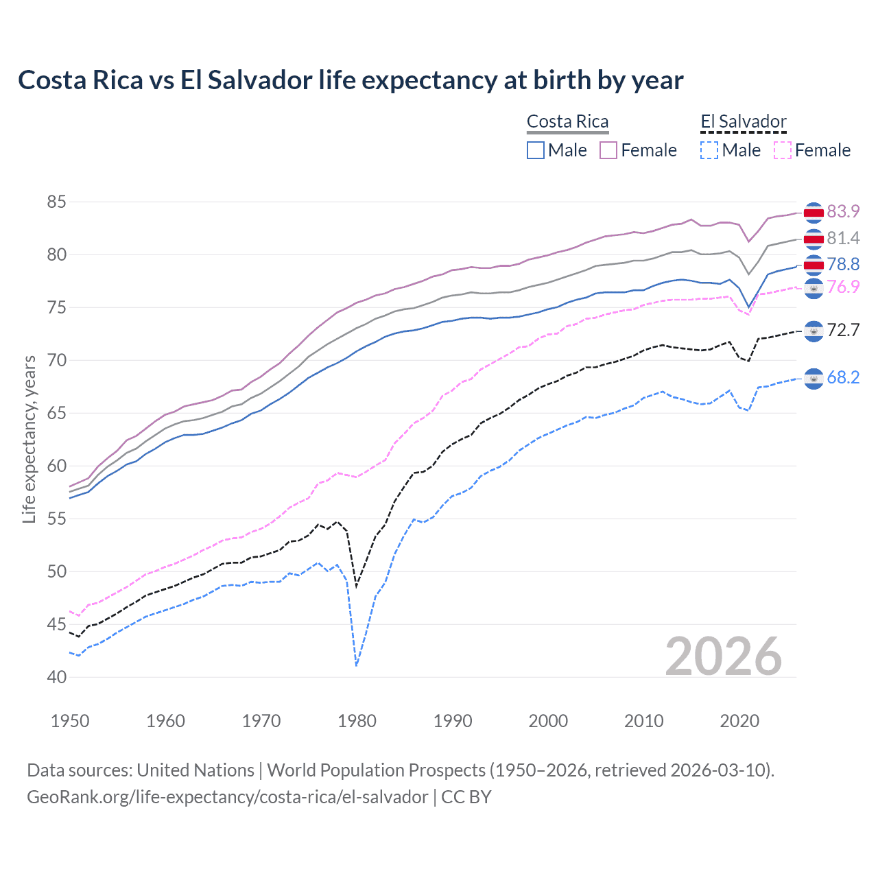 The average life expectancy at birth is 81.4 years in Costa Rica vs 72.7 in El Salvador. Costa Rica is ranked 39/197 by life expectancy, and El Salvador is 116/197. In Costa Rica, the life expectancy is 78.8 years for males and 83.9 years for females. In El Salvador, it's 68.2 years for males and 76.9 years for females.